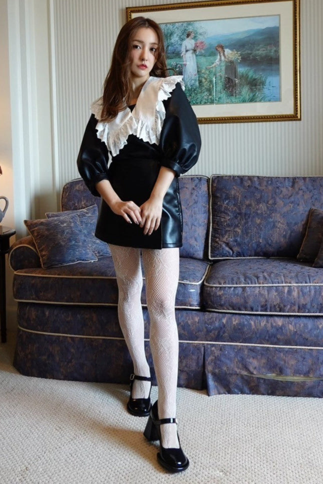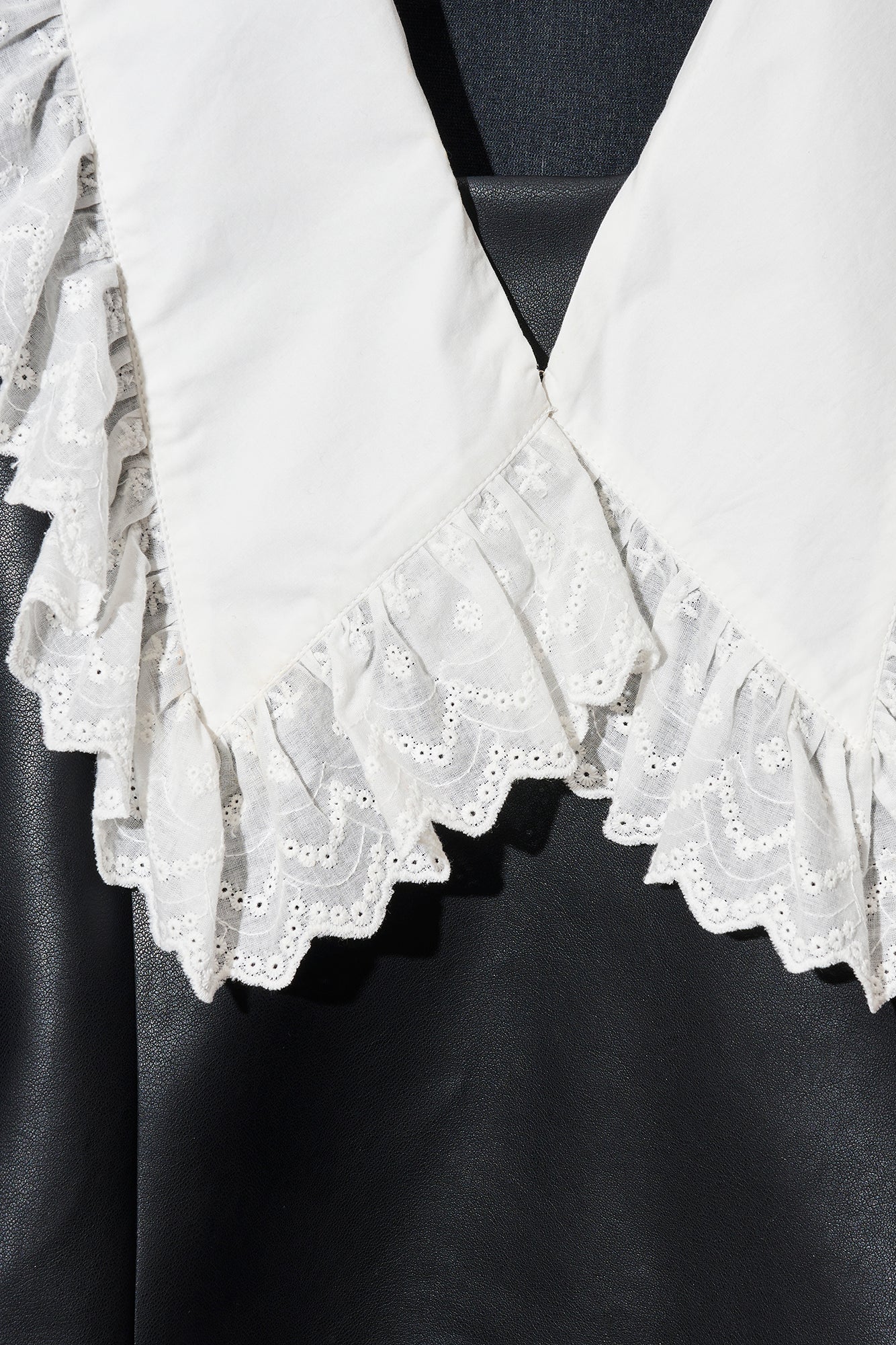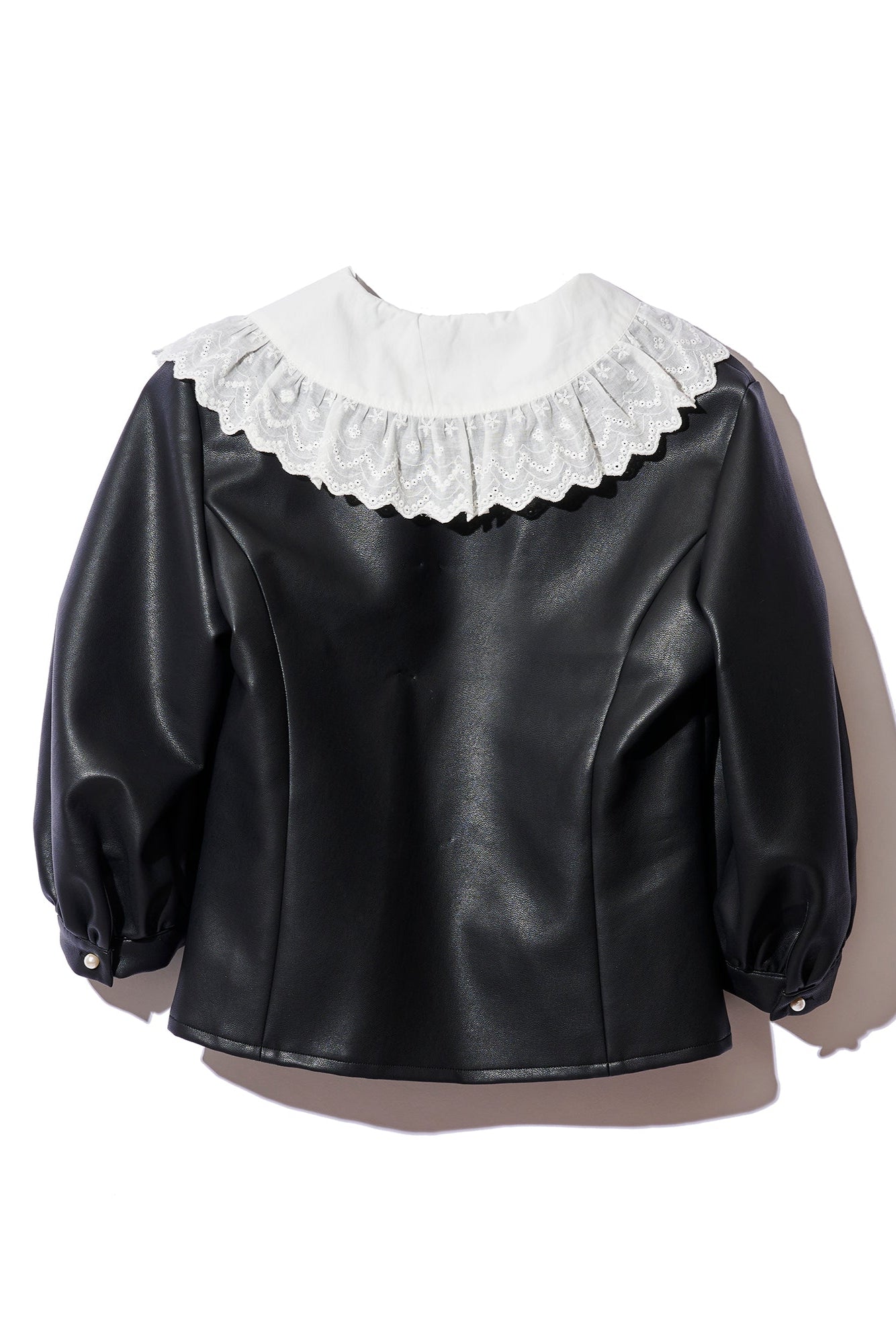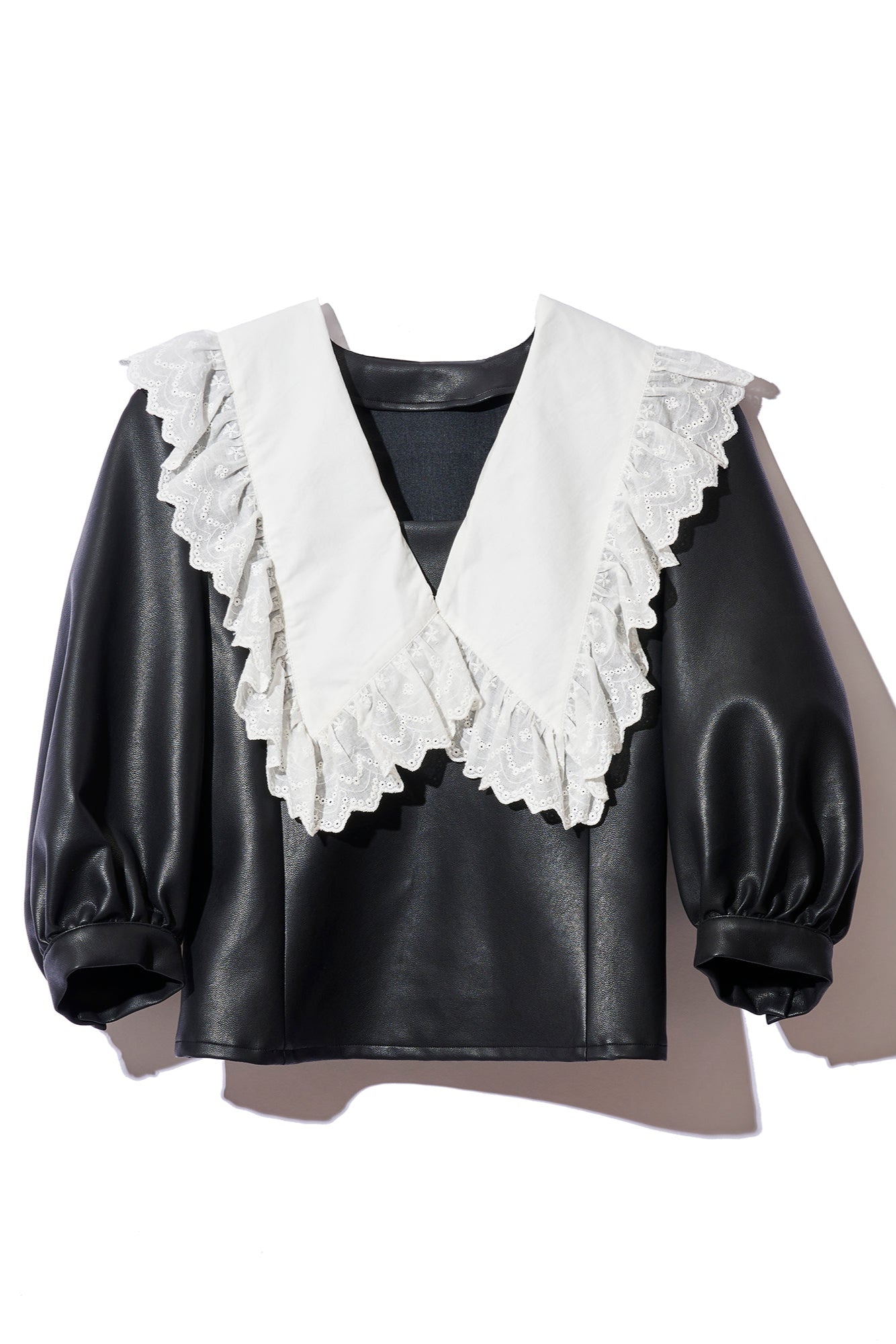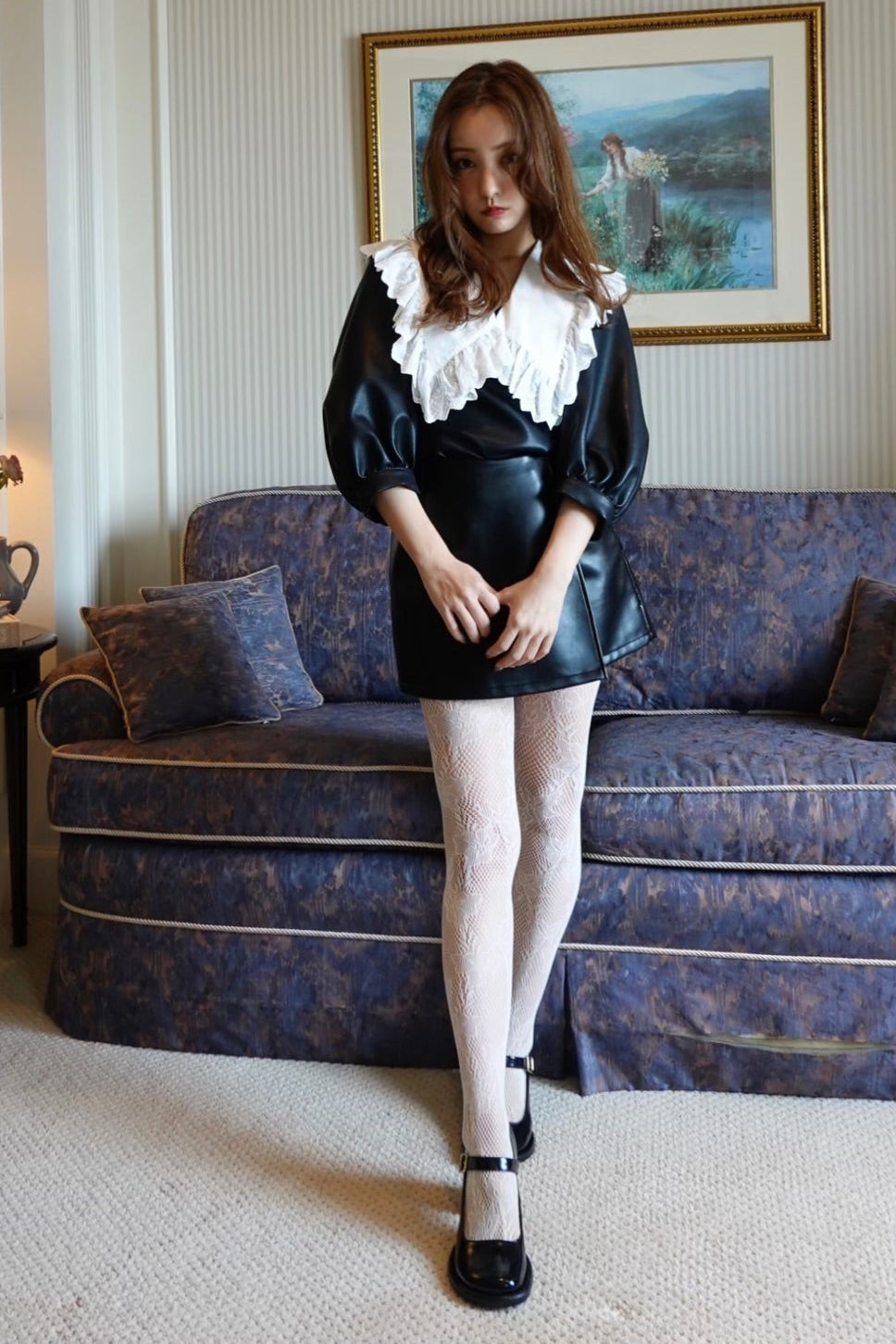 印象的なボリューム感のあるレースのビックカラーを仕立てたトップス&ボトムス。タックをよせふんわり仕上げた袖口もクラシカルな印象に。