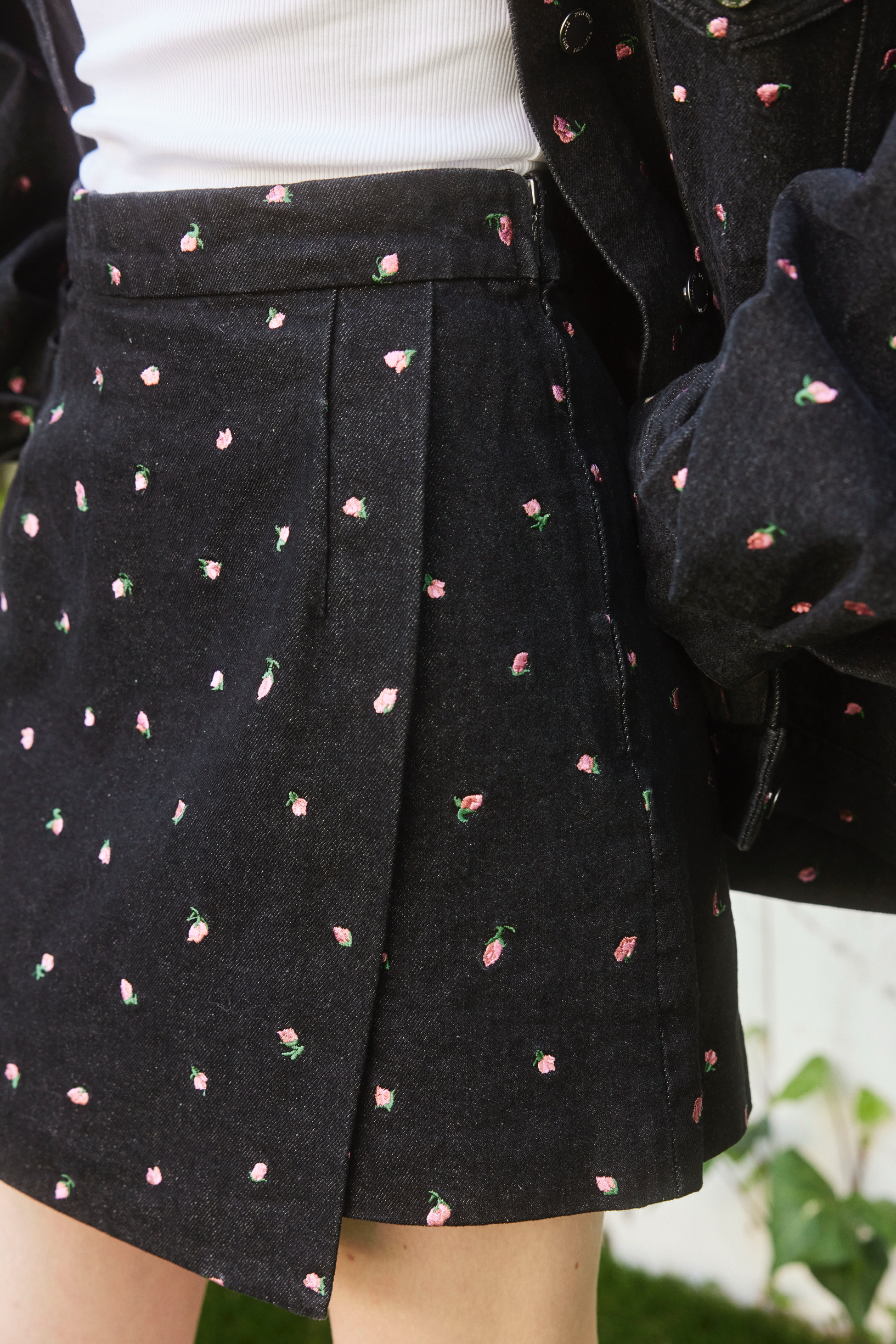 同刺繍柄を施したデニムジャケットとセットアップでもお楽しみいただけます。