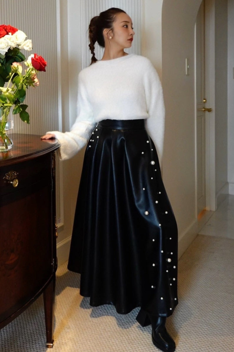 シンプルなトップスが際立つラグジュアリーな素材とデザイン。