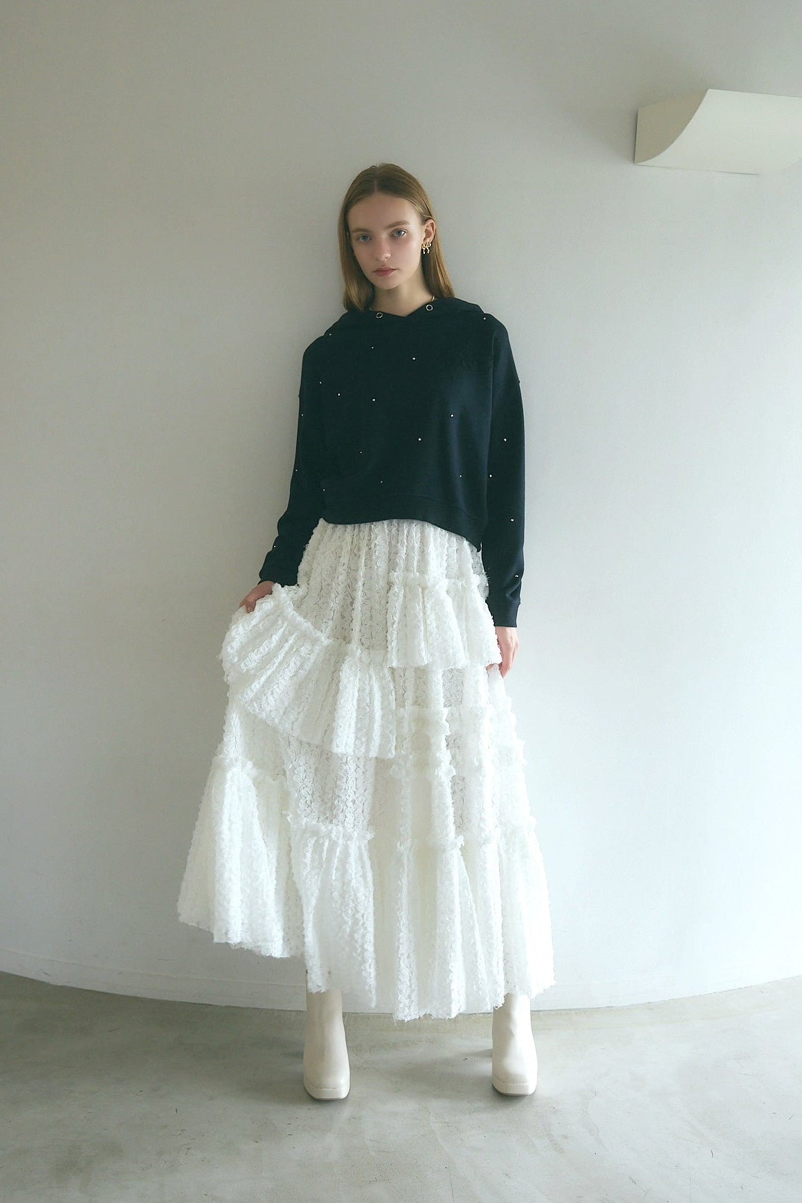 縦のラインを強調する段切替デザインで、自然に脚長効果を叶えます。