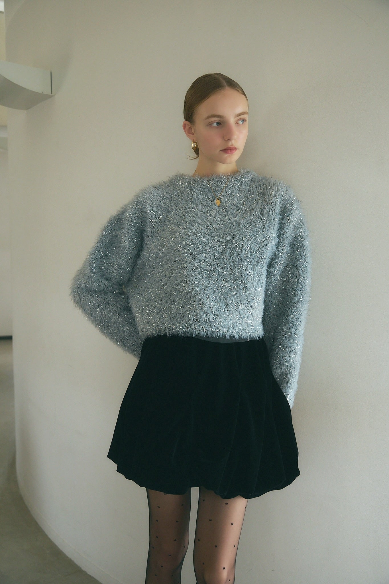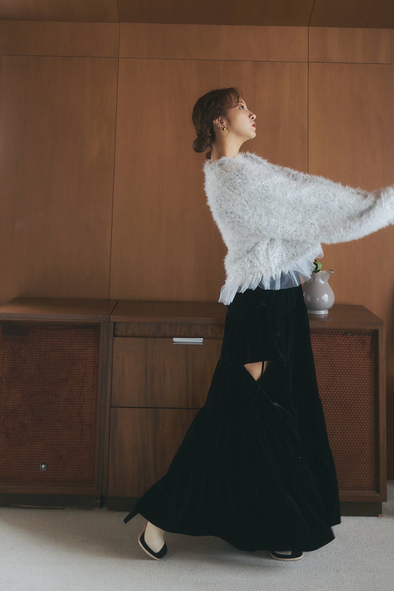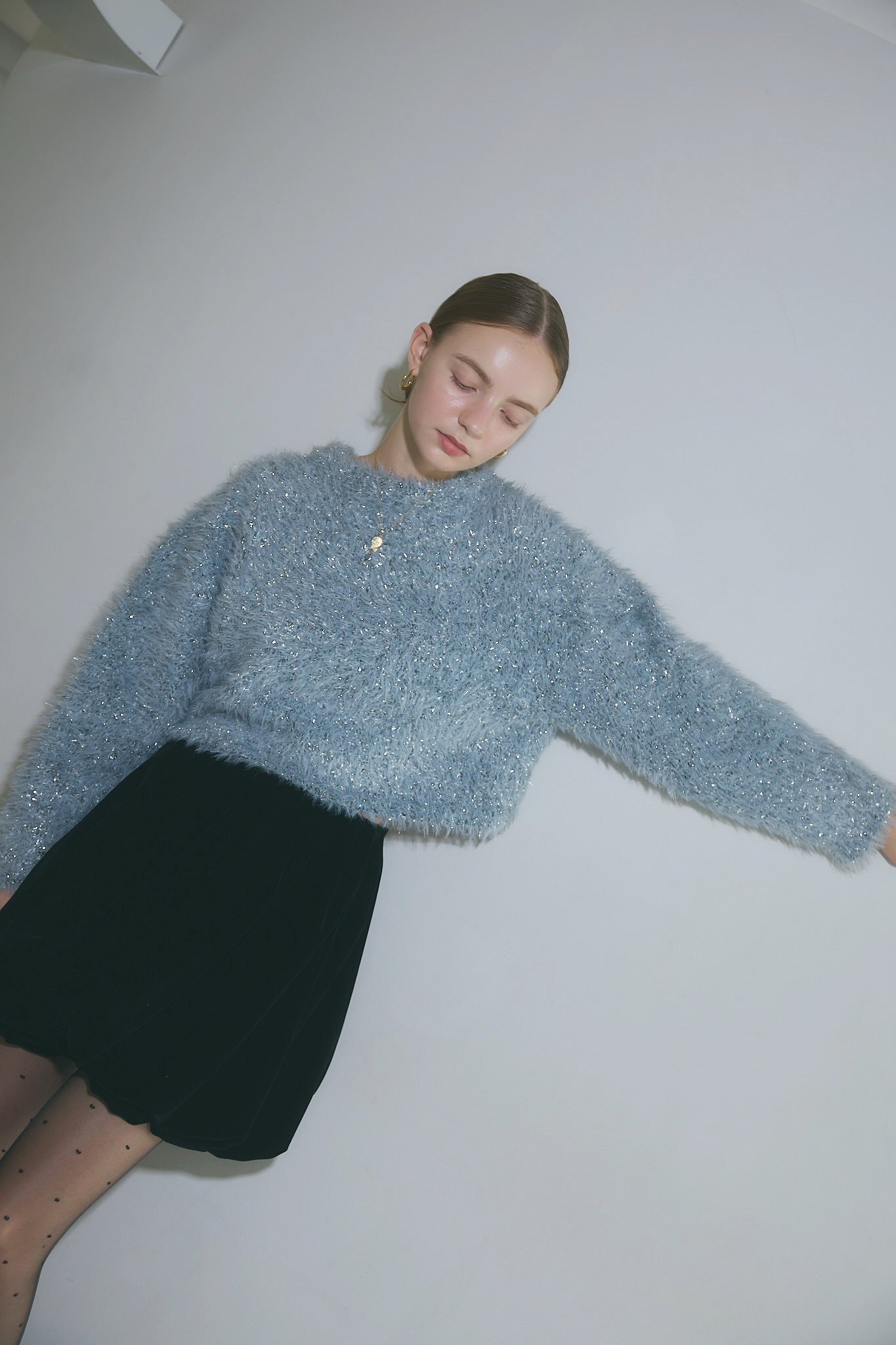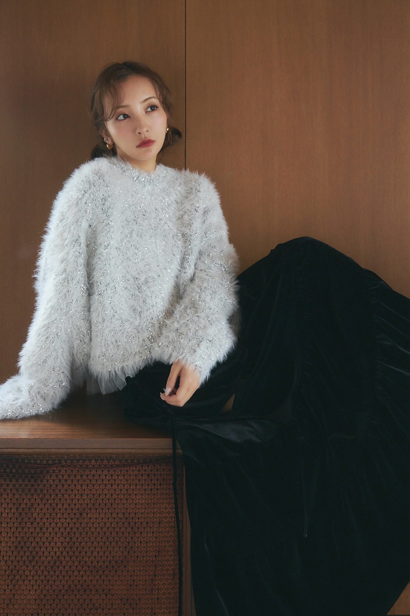 シルバーラメ糸を織り込んだファーニット素材。動くたびにさりげなく輝く素材です。