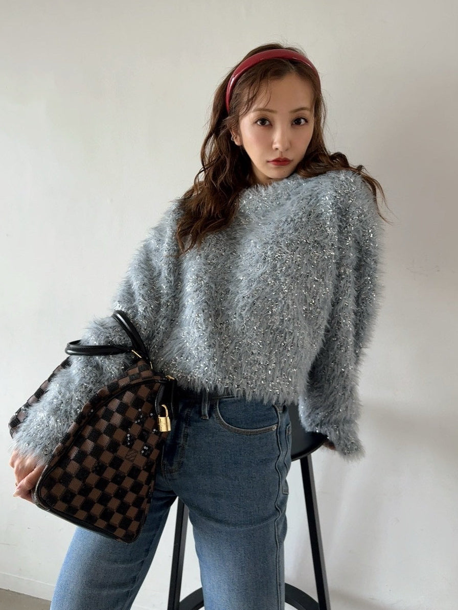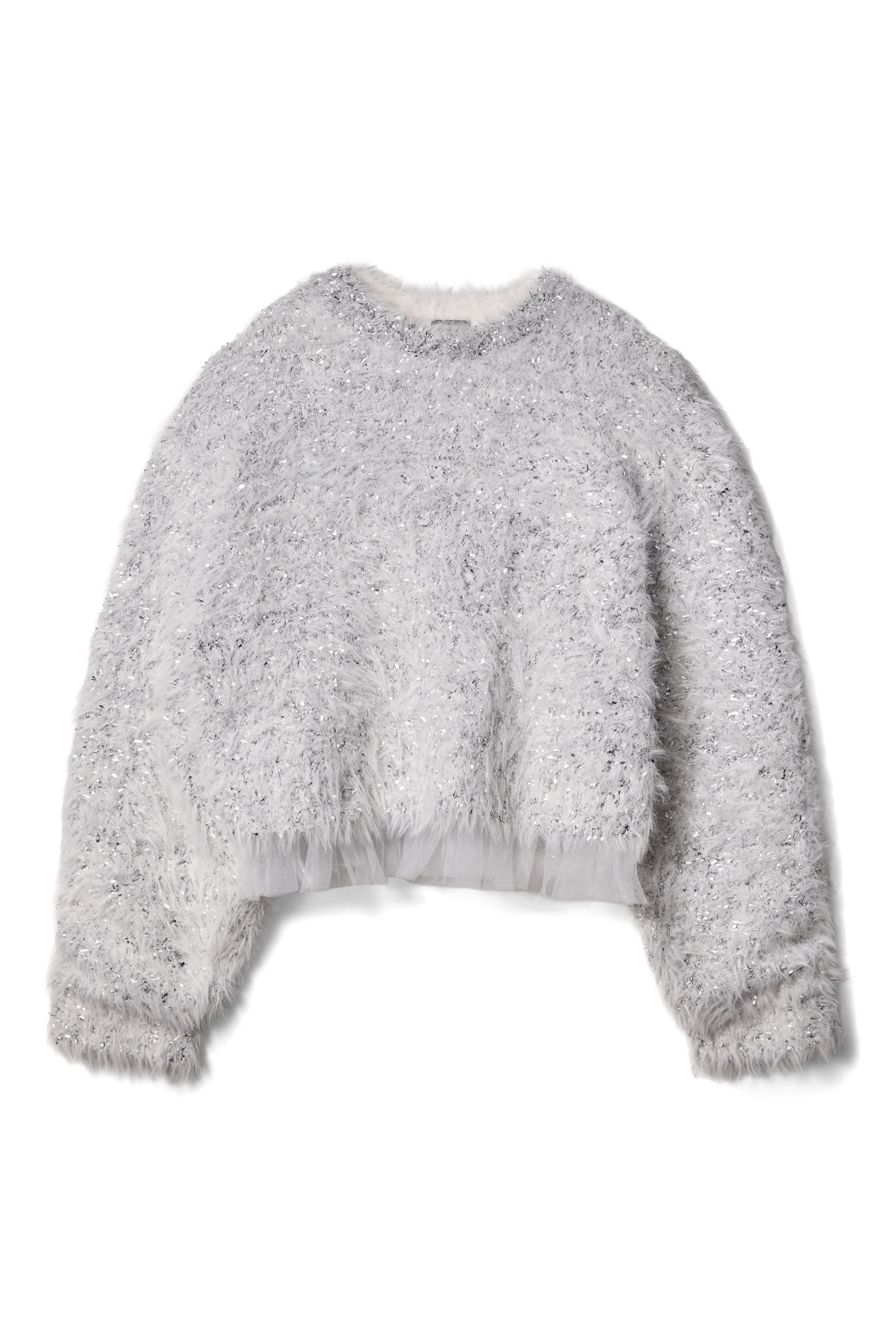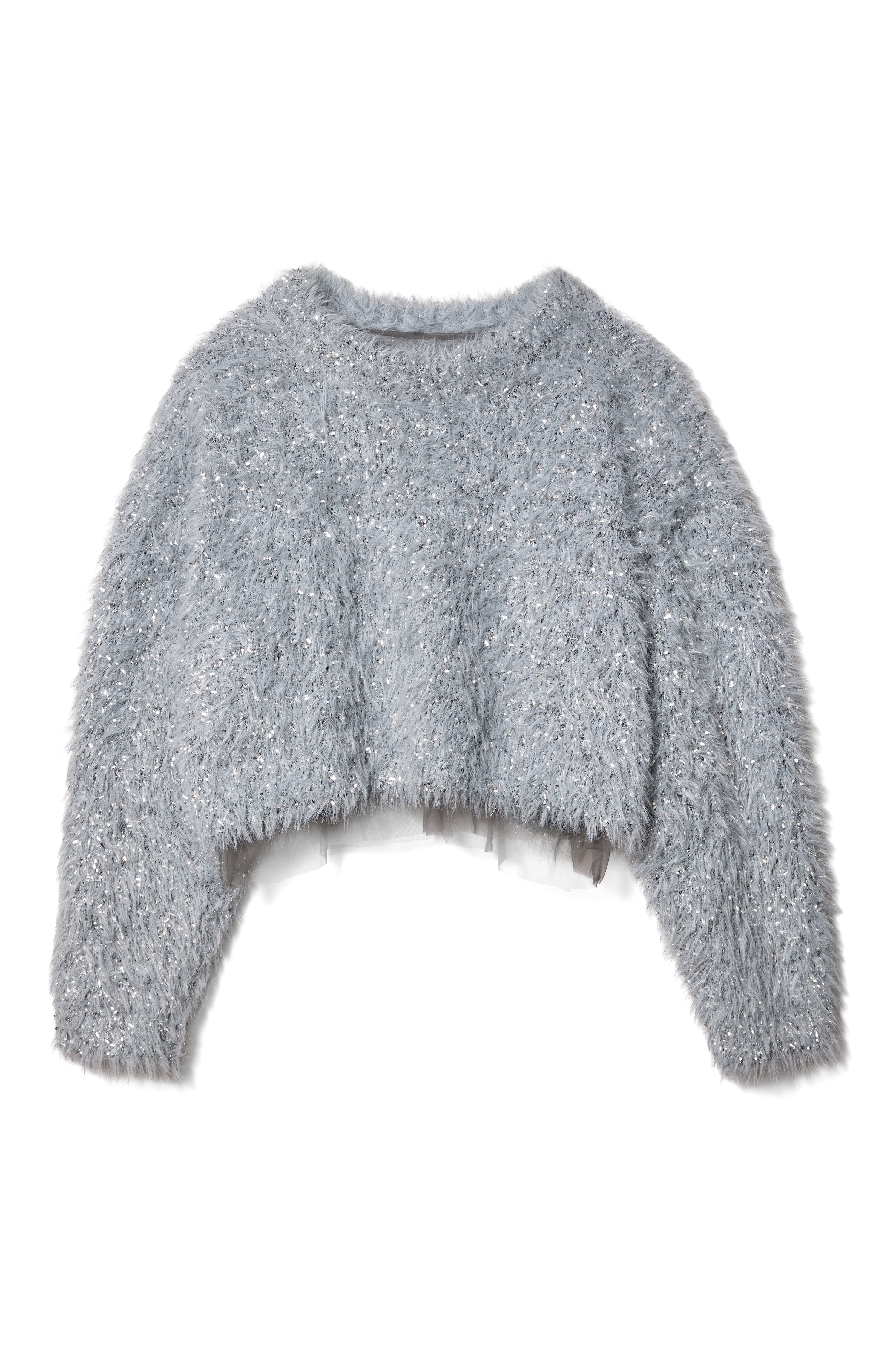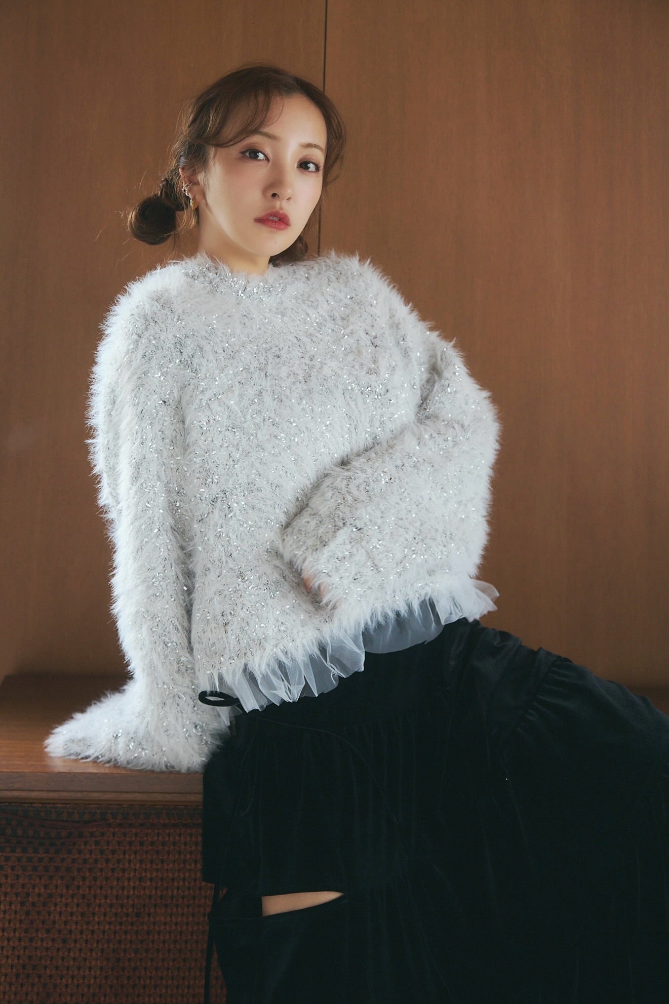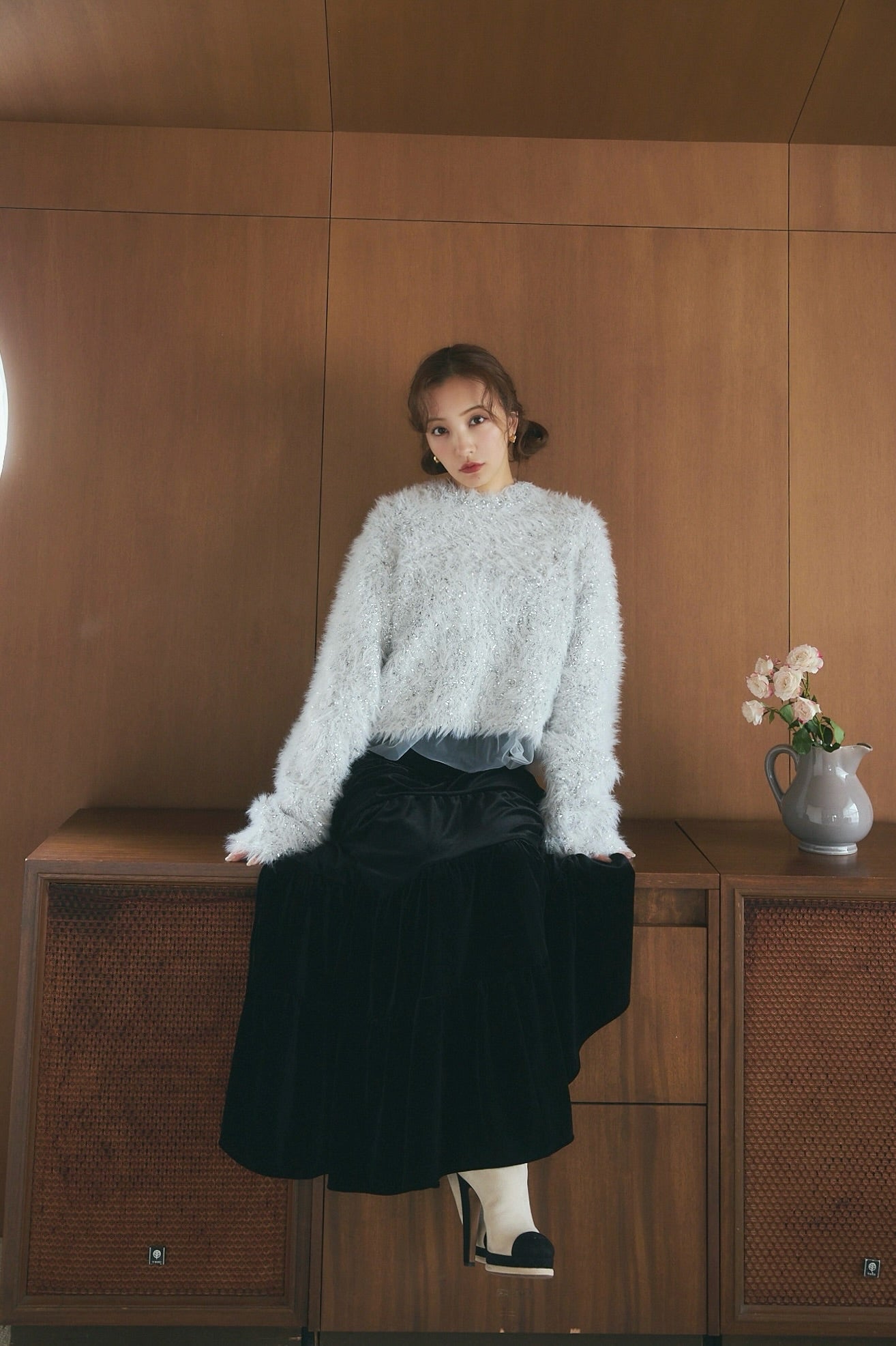 シルバーラメ糸を織り込んだファーニット素材。動くたびにさりげなく輝く素材です。
