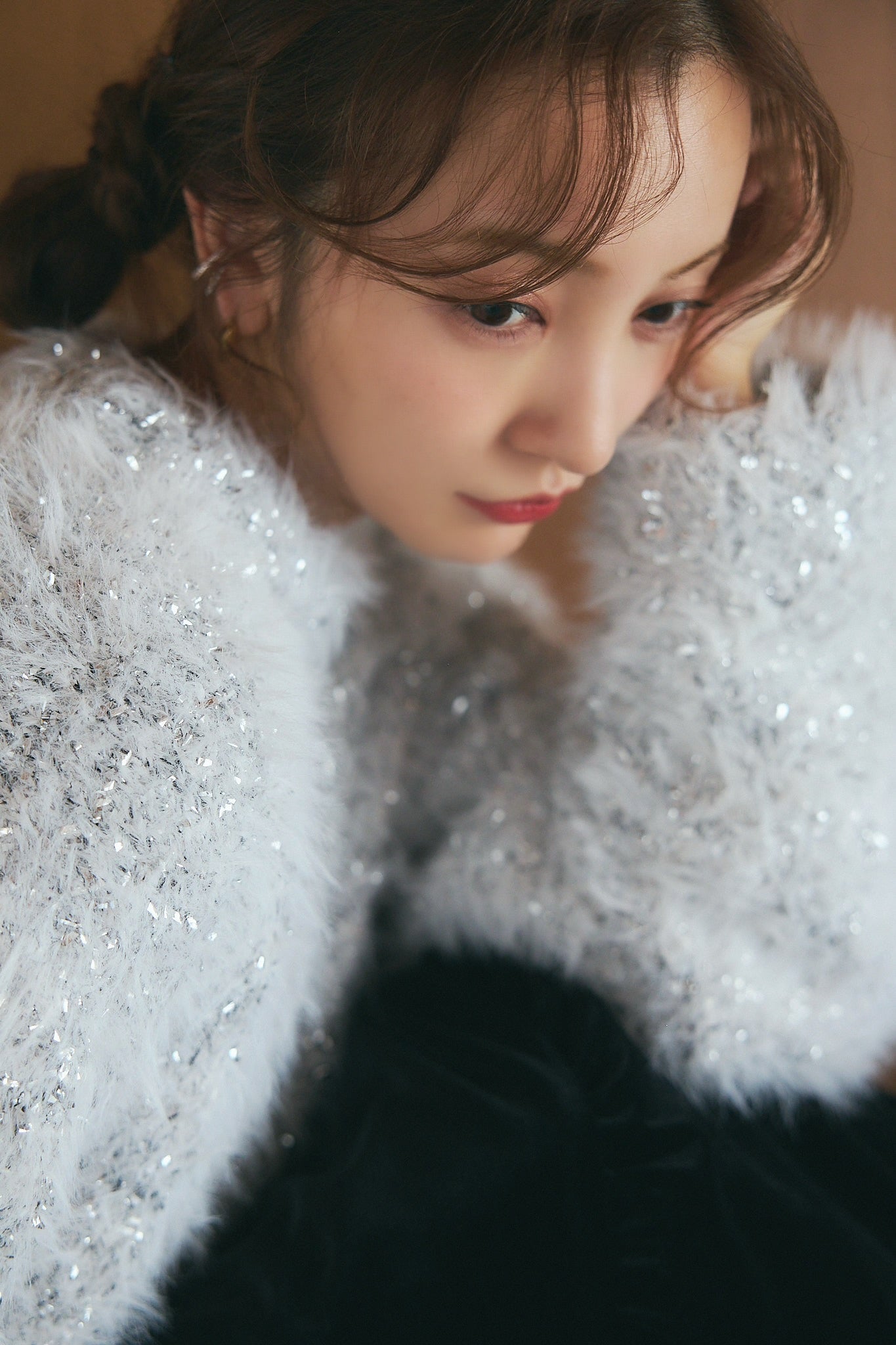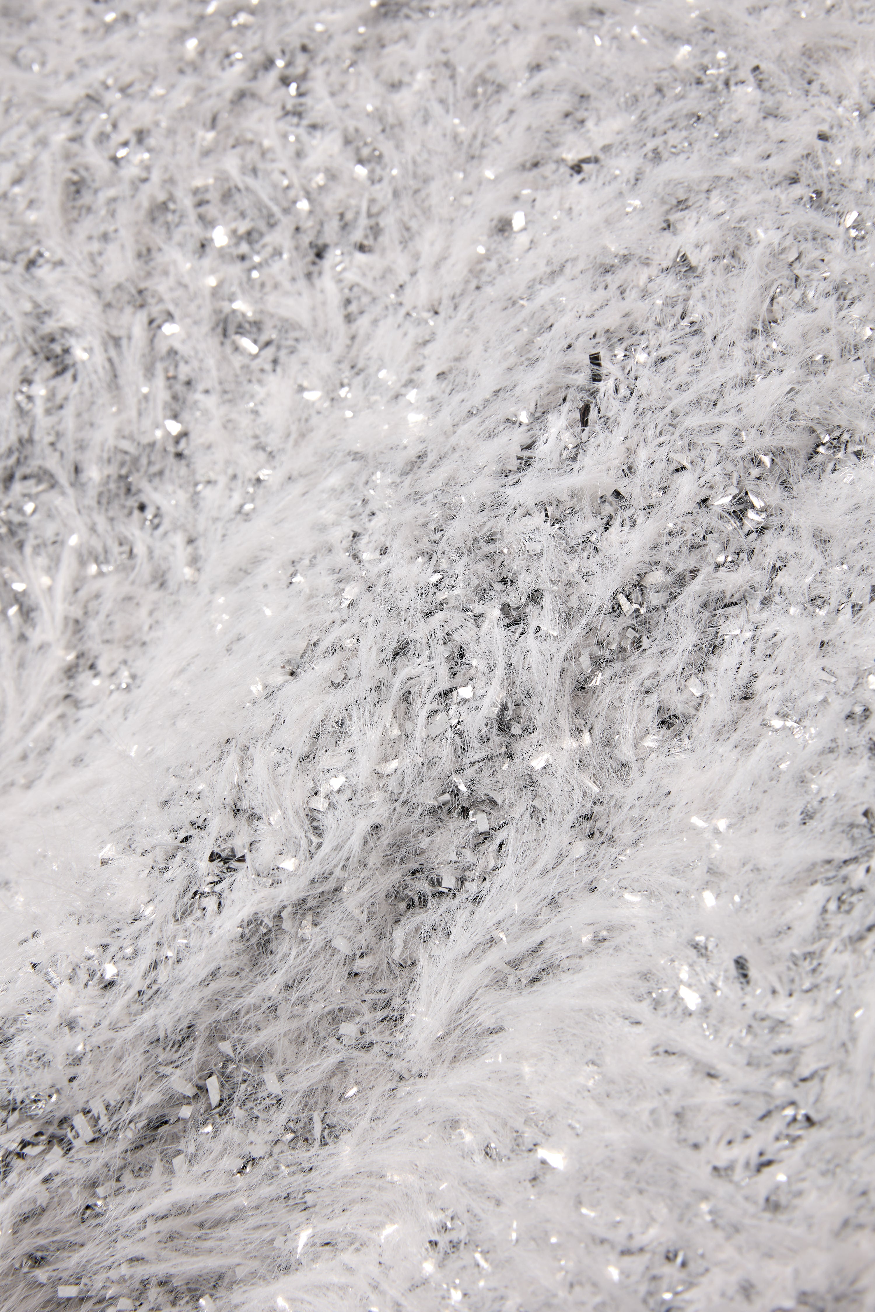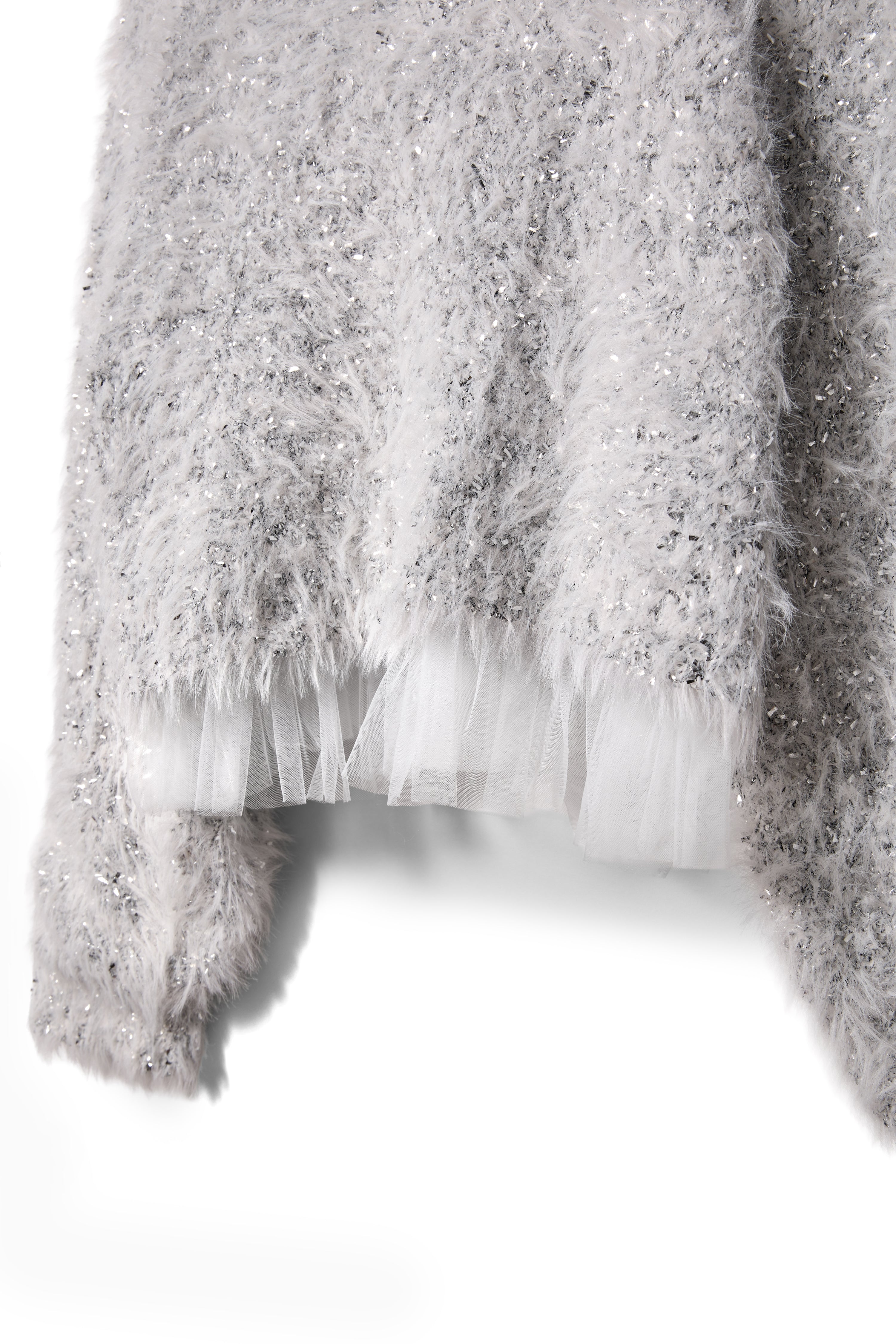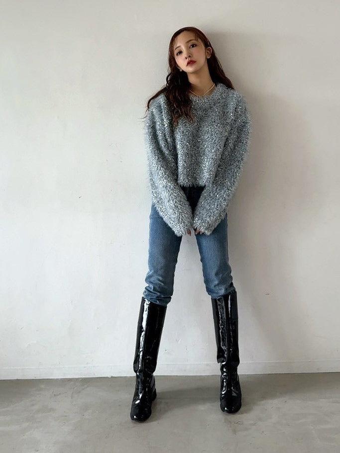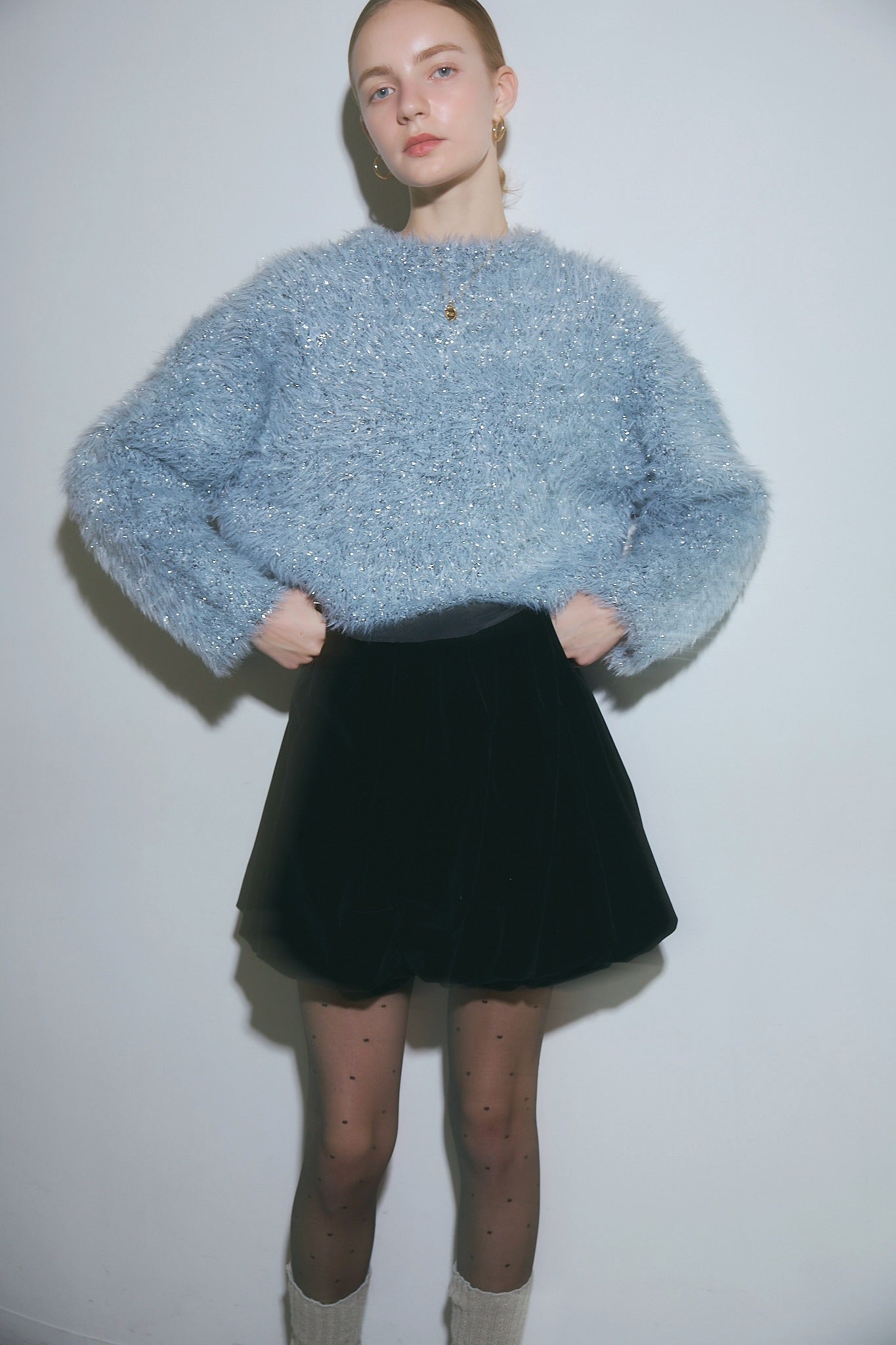 シルバーラメ糸を織り込んだファーニット素材。動くたびにさりげなく輝く素材です。