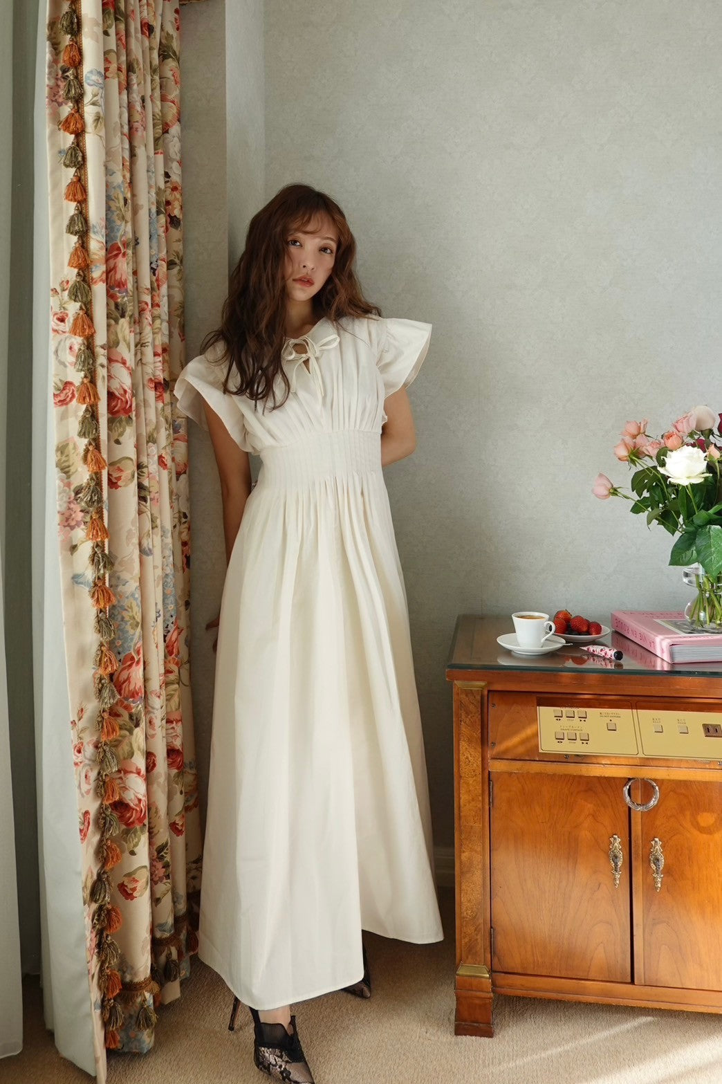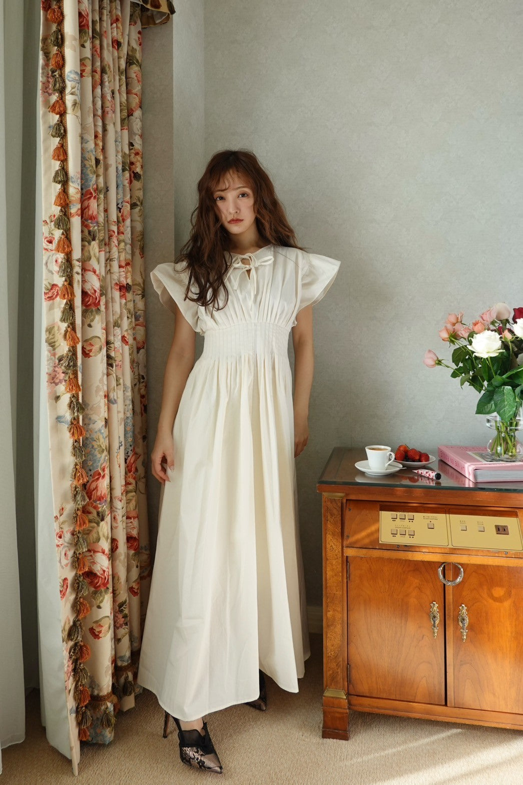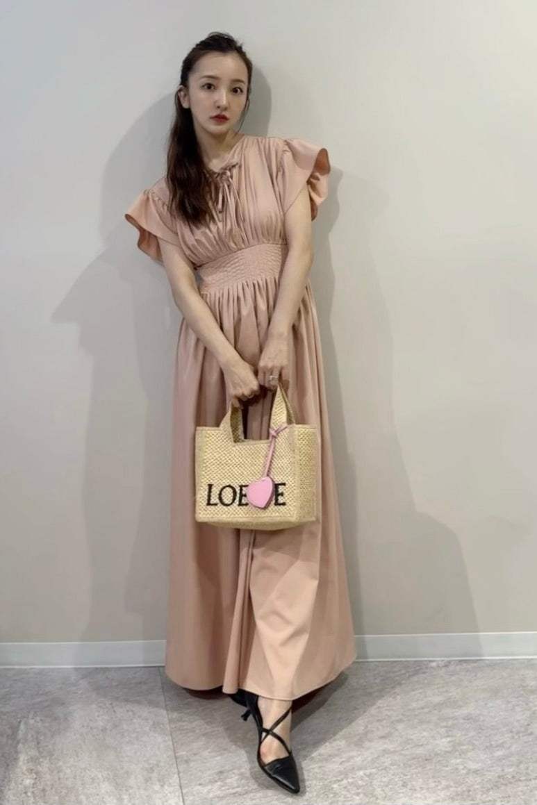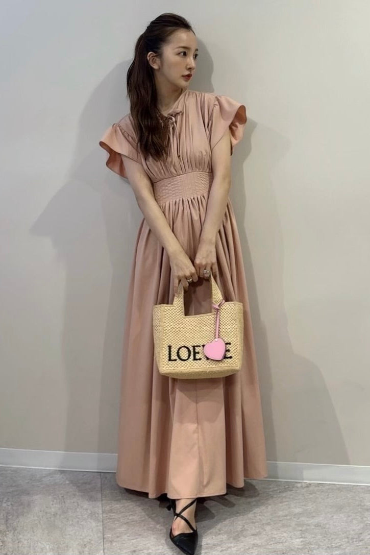 胸元にはさりげなくあしらわれたリボンが、上品でフェミニンな印象を引き立てます。