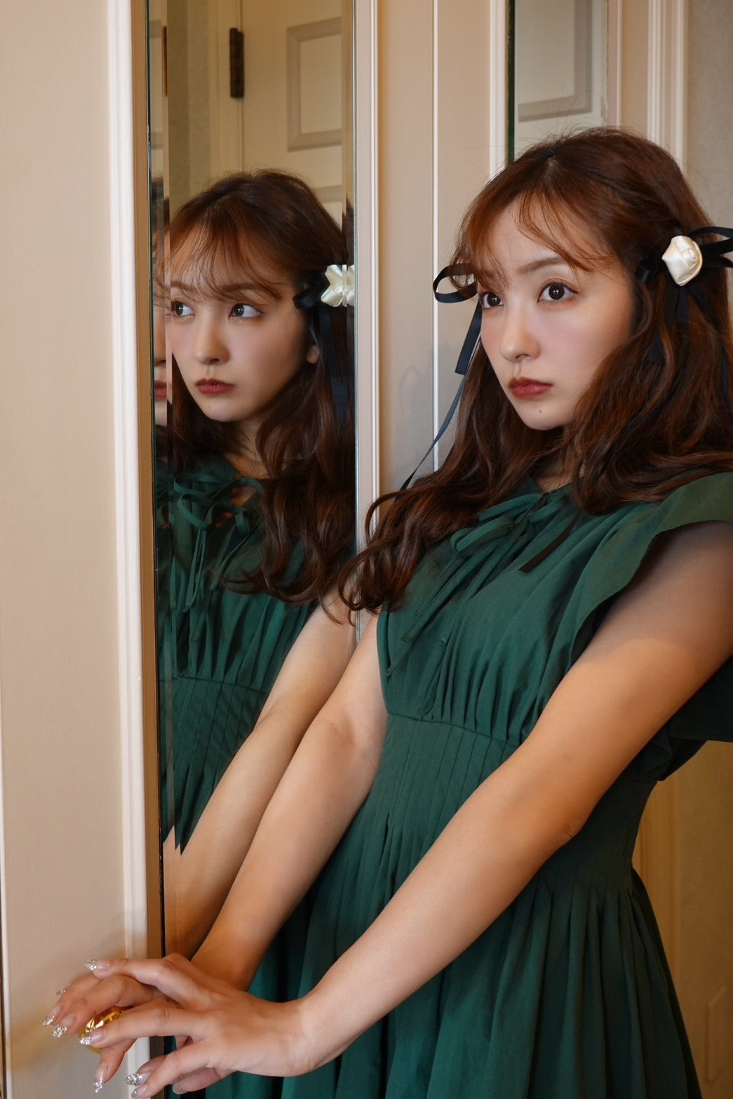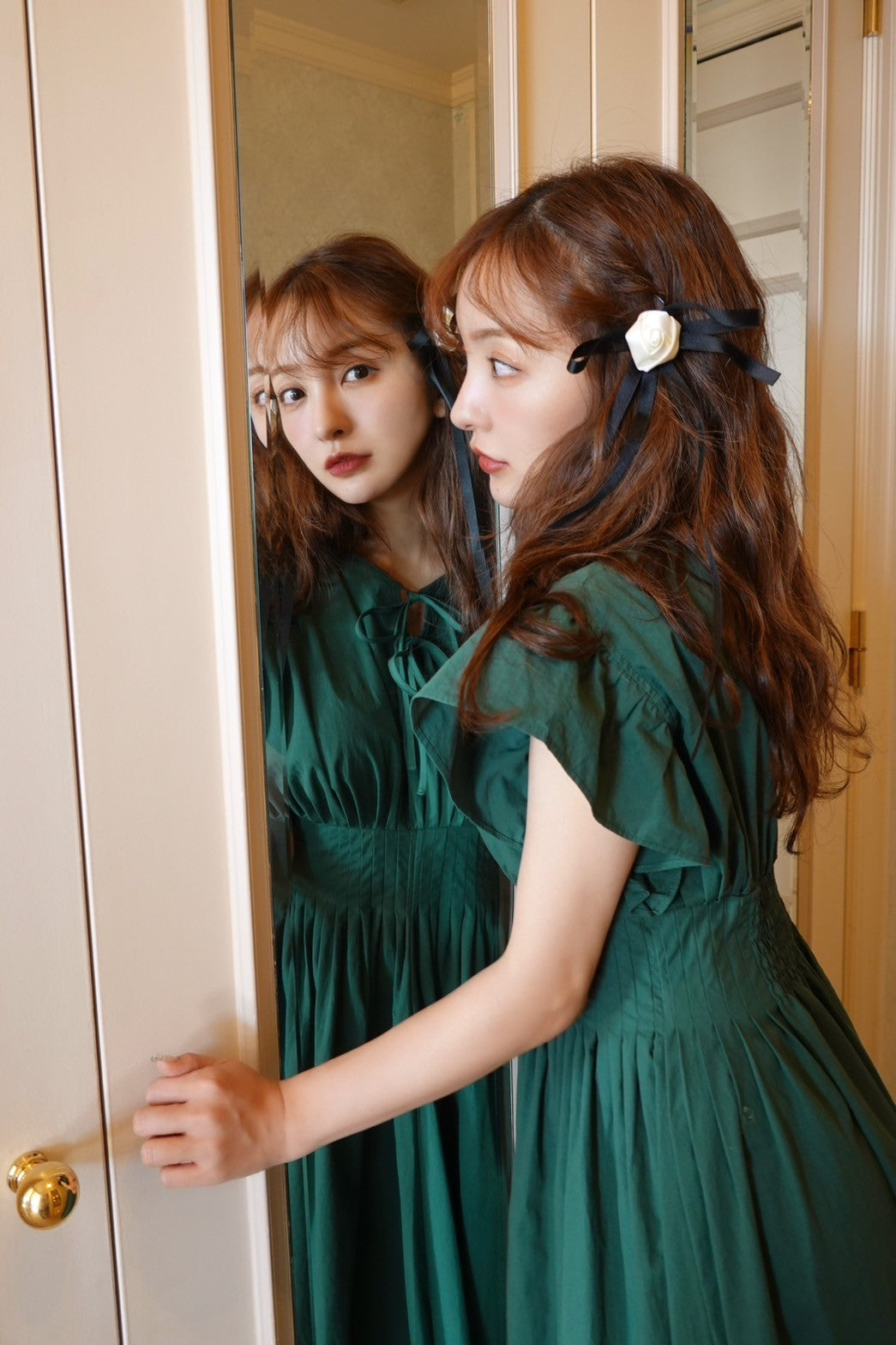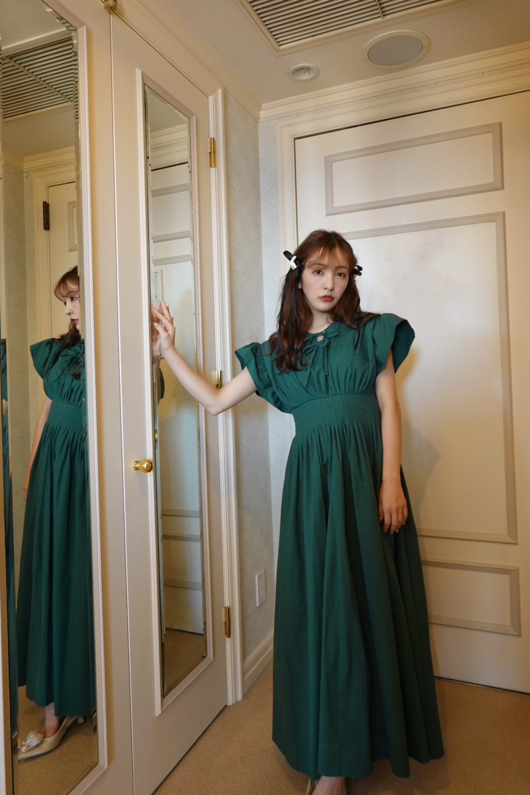 胸元にはさりげなくあしらわれたリボンが、上品でフェミニンな印象を引き立てます。