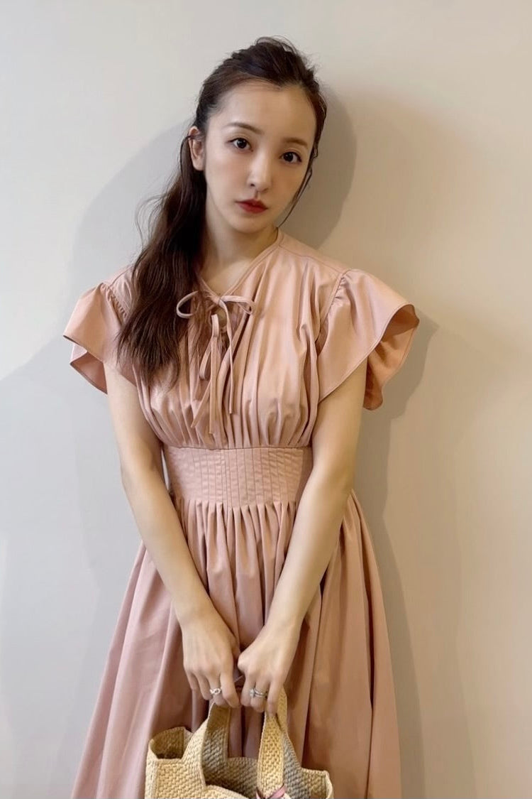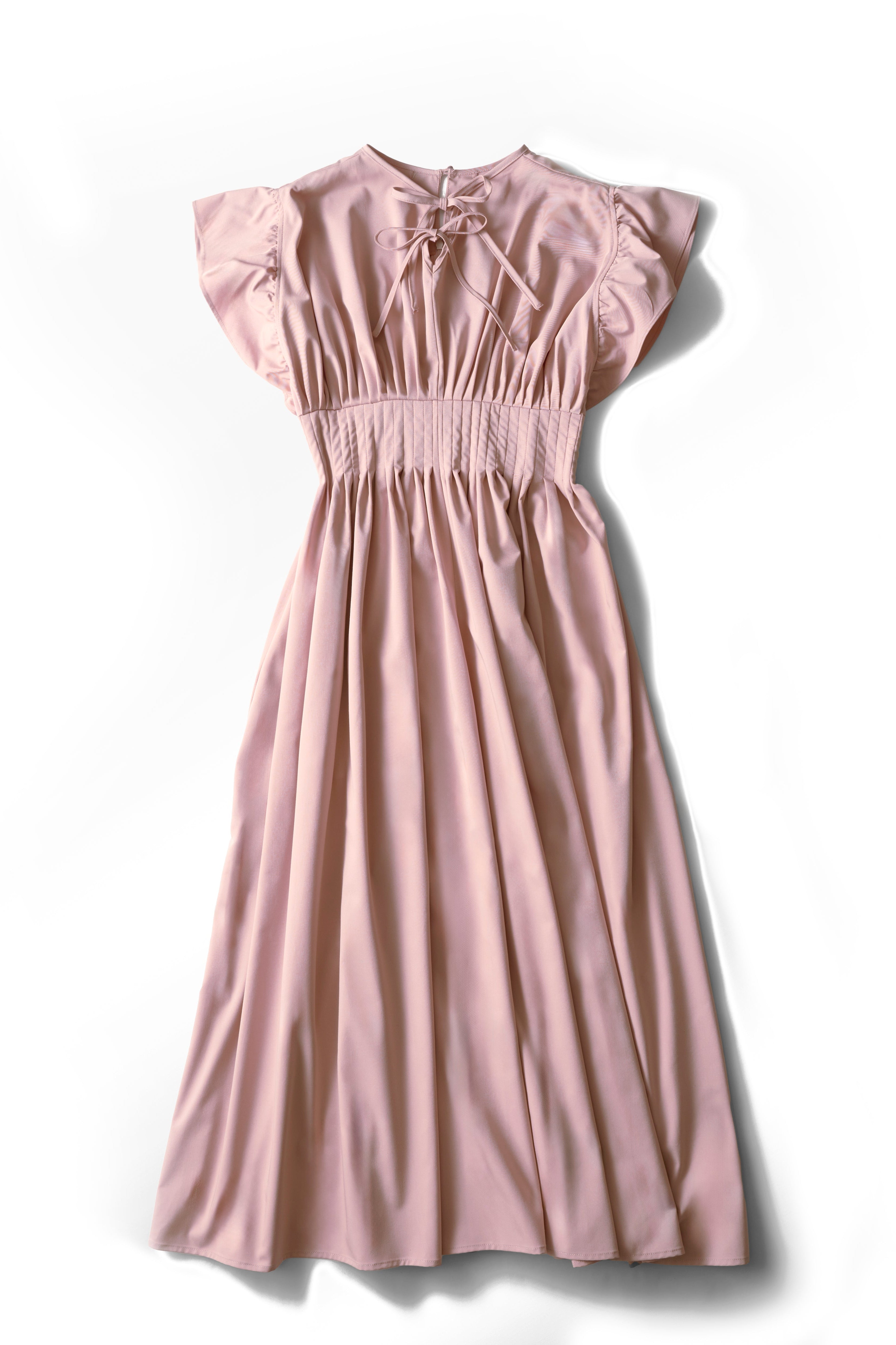 バスト部からウエスト位置にかけてギャザーデザインを施し、