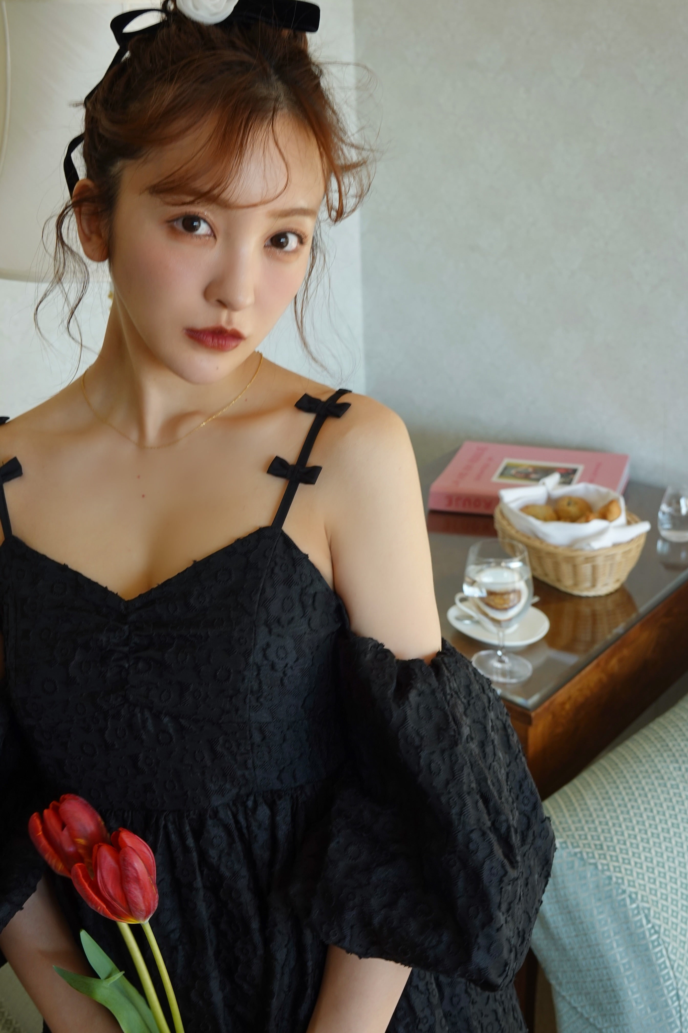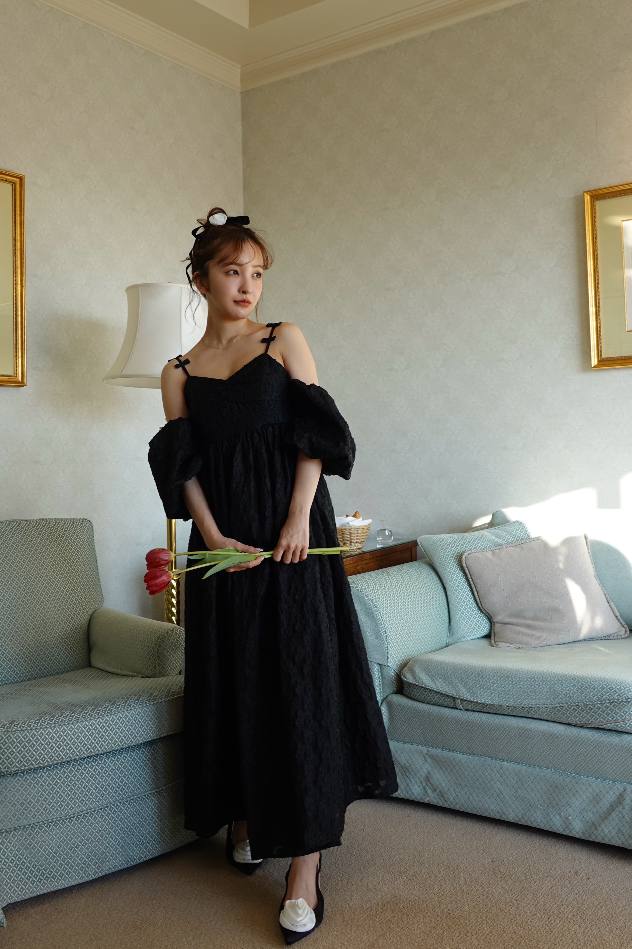 ストラップには小さいリボンをつけデコルテ部分を華やかに演出。