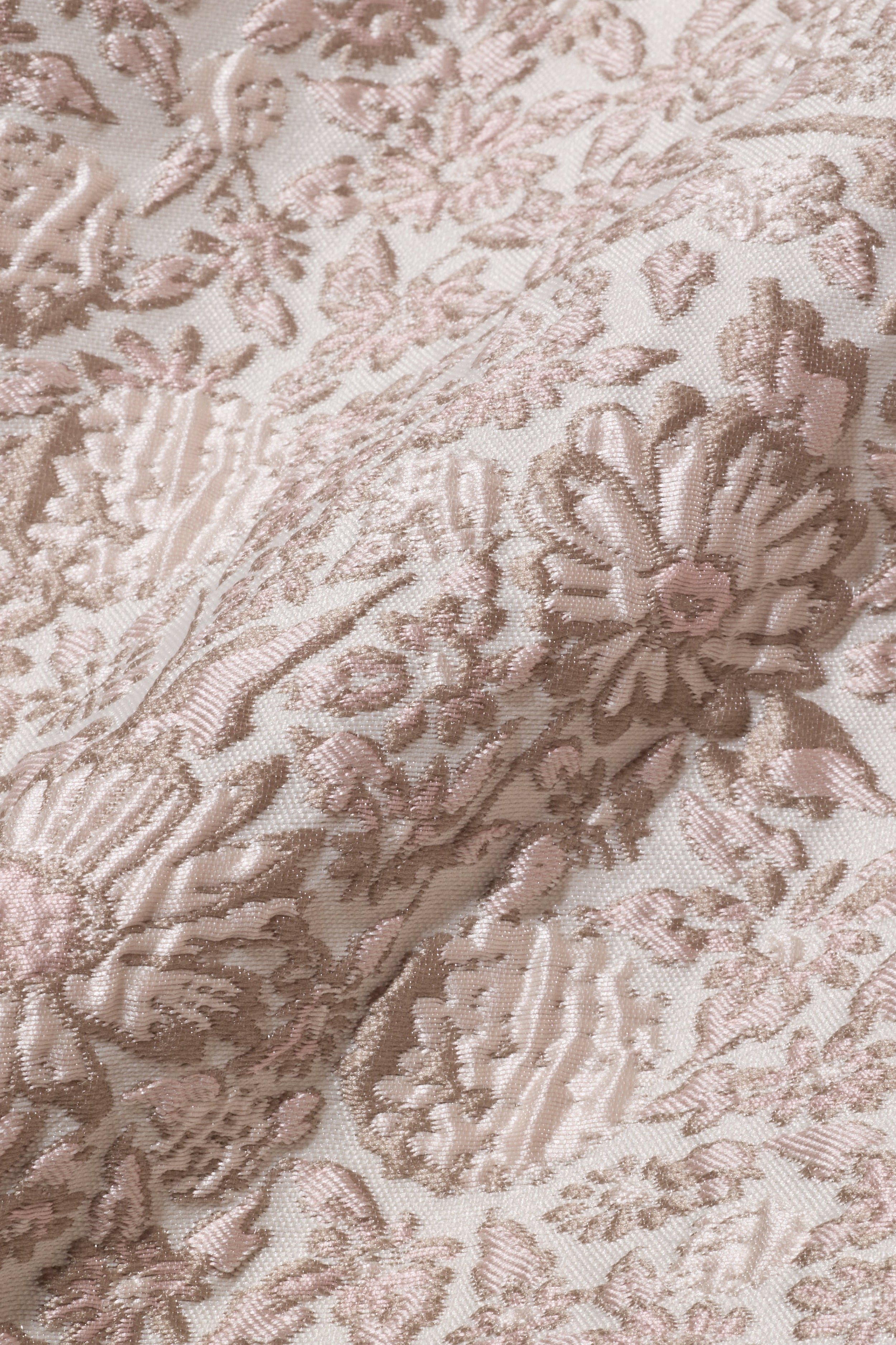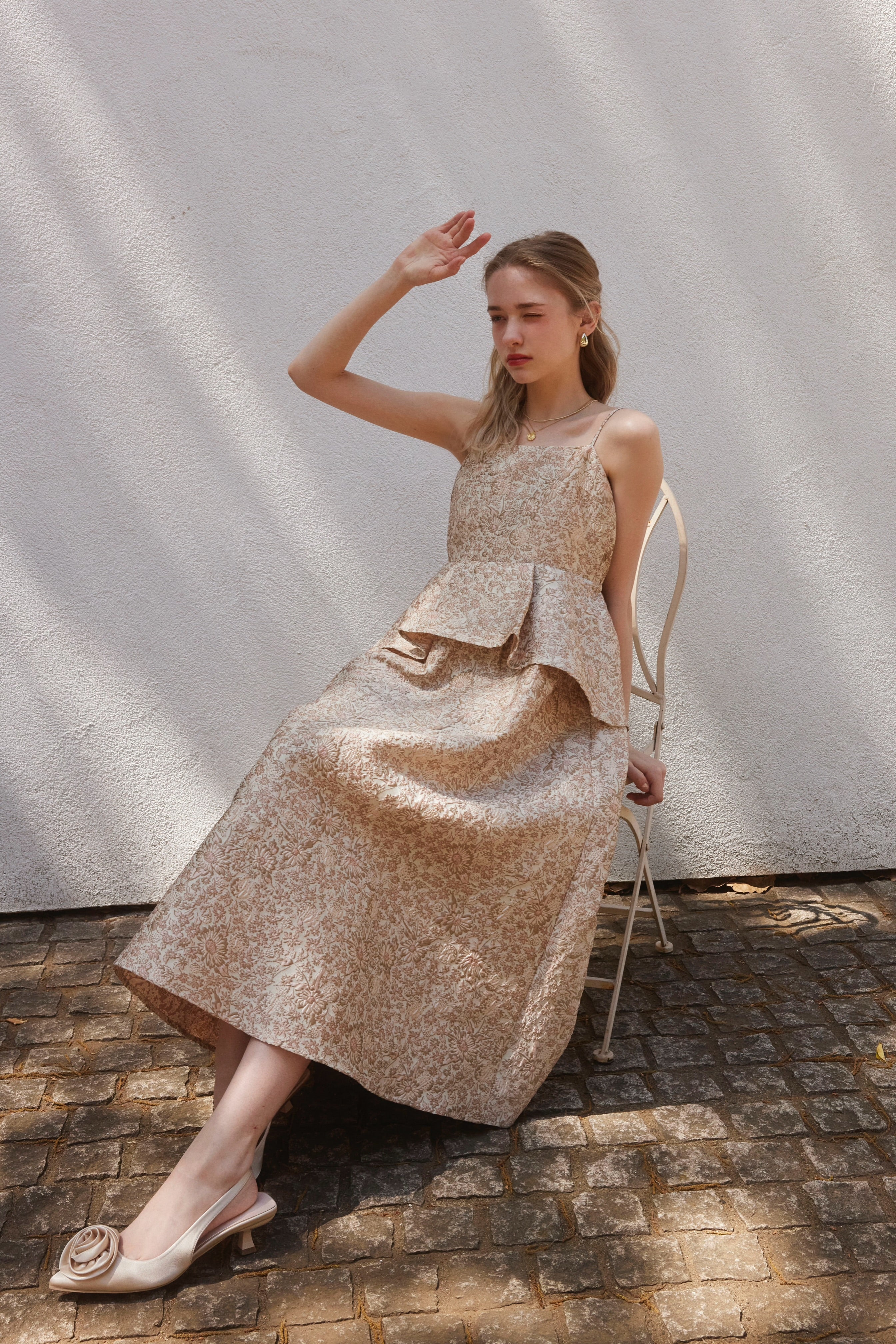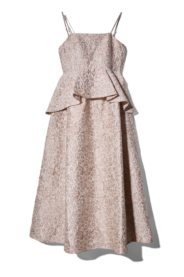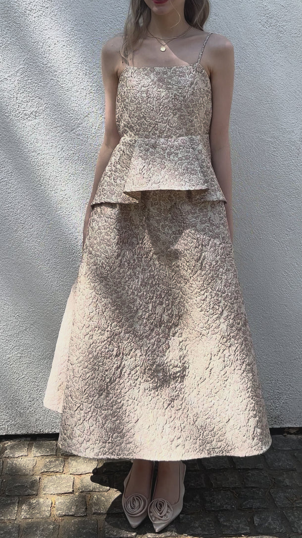 クラシカルなジャガード素材とモダンなペプラムディテールが融合したデザイン。