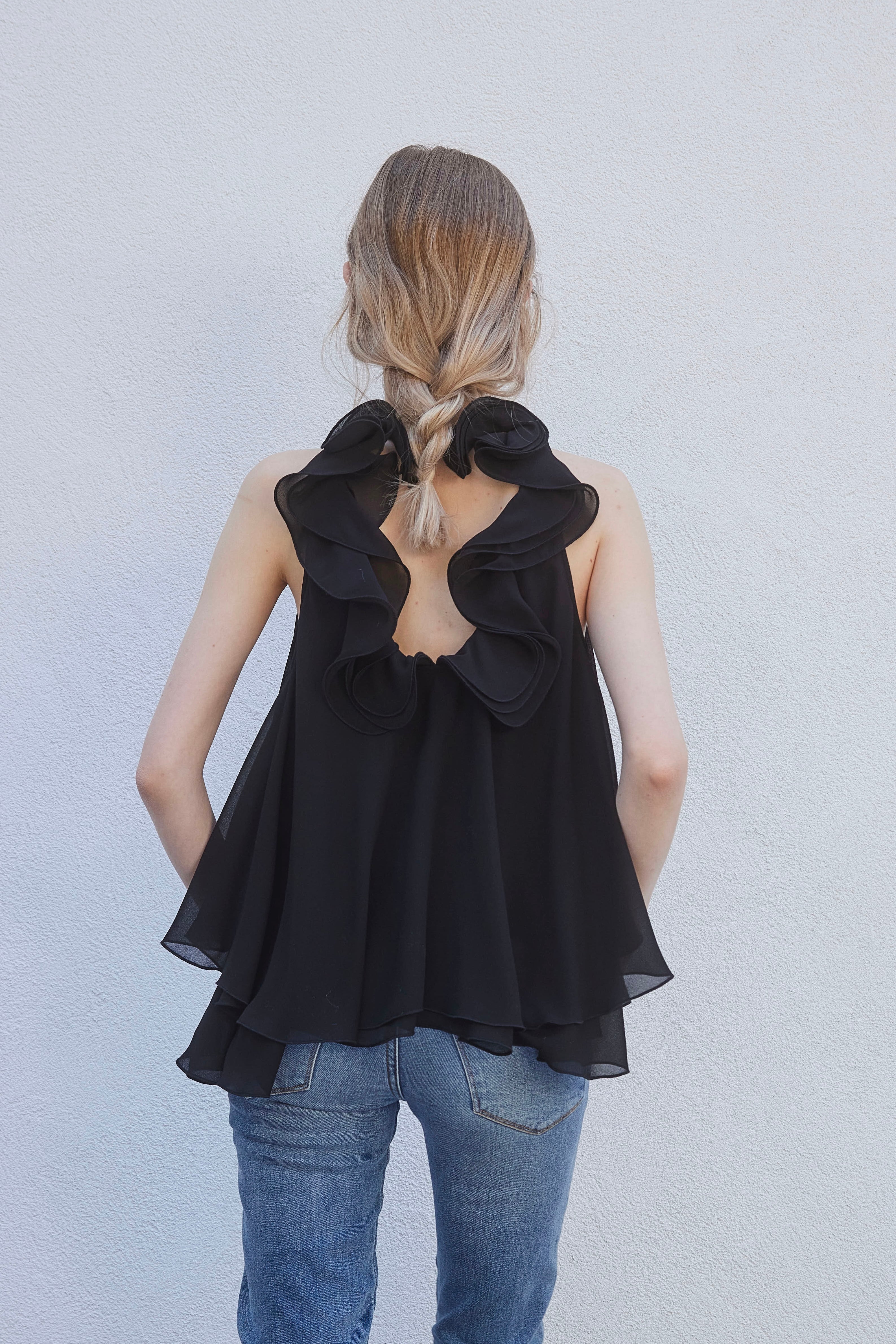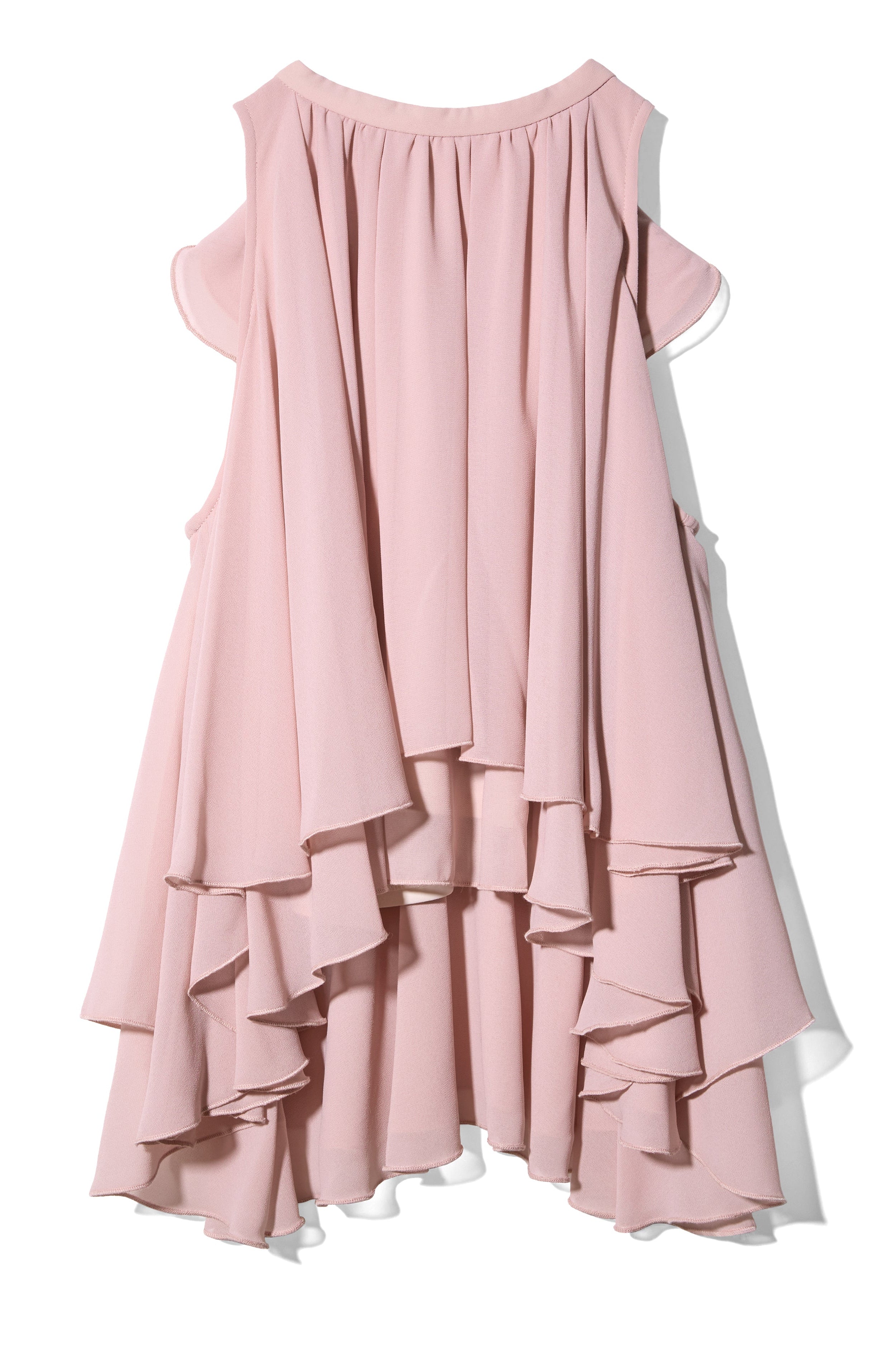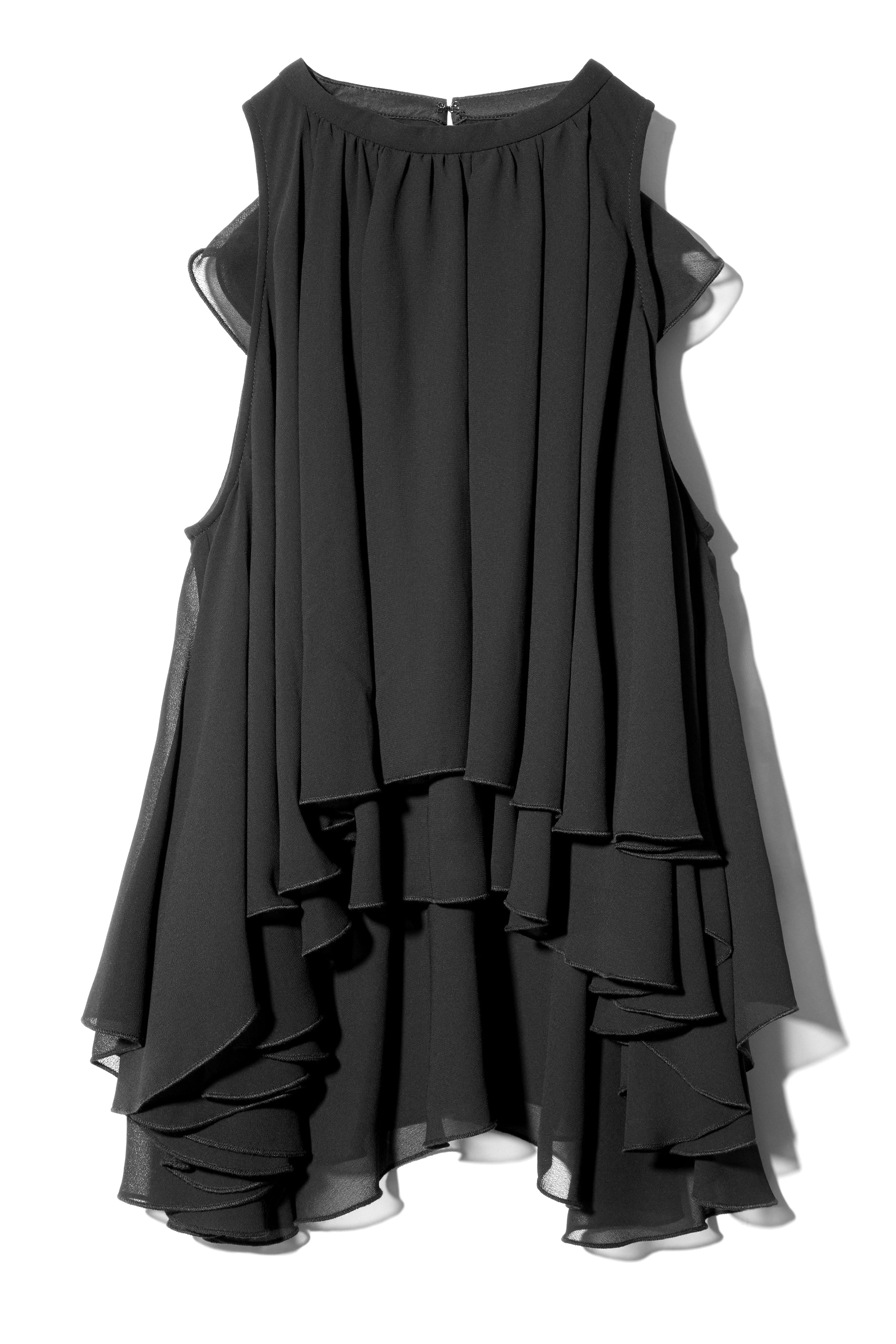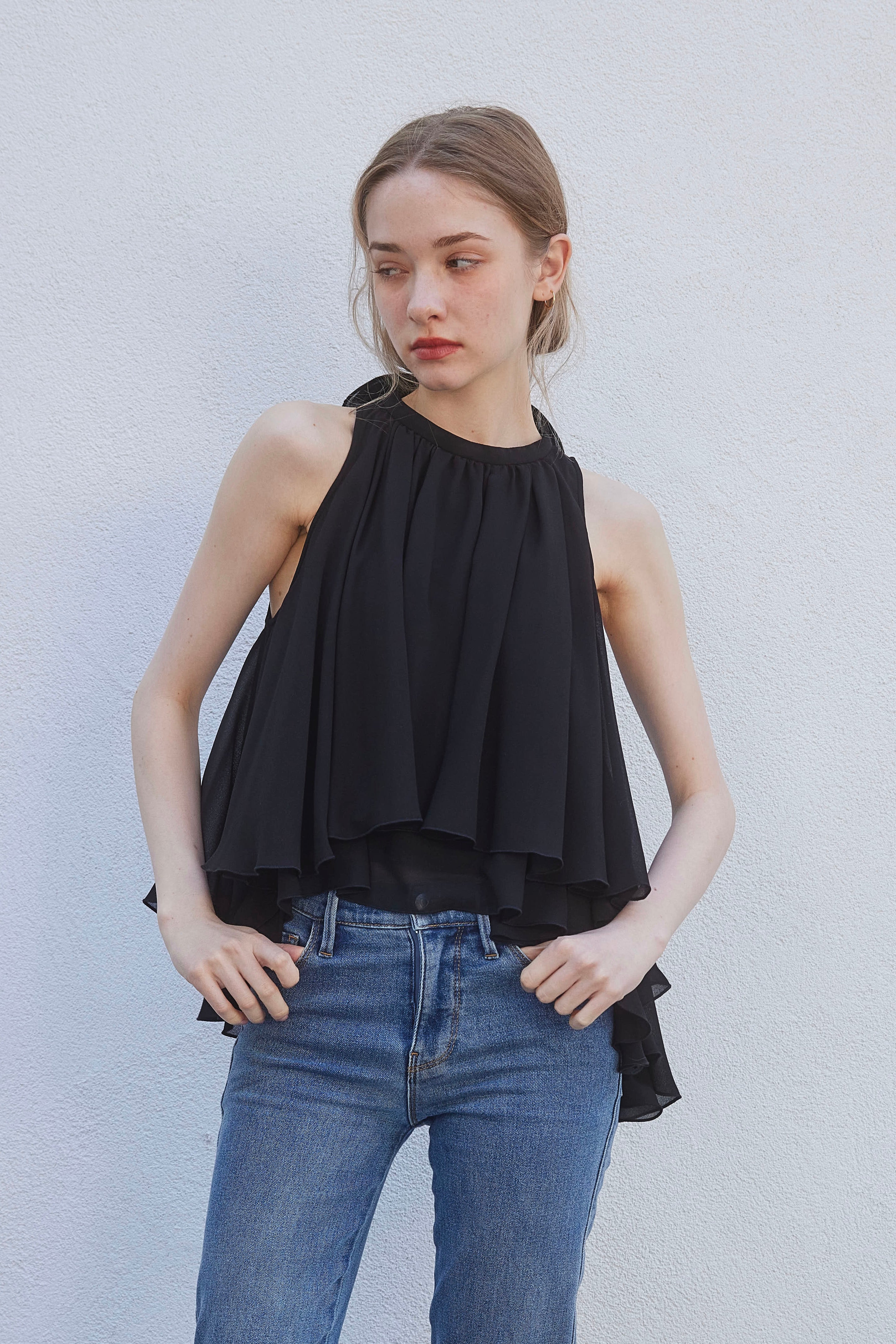 ふんわりと広がるティアードデザインが印象的な、ノースリーブシフォンブラウス。