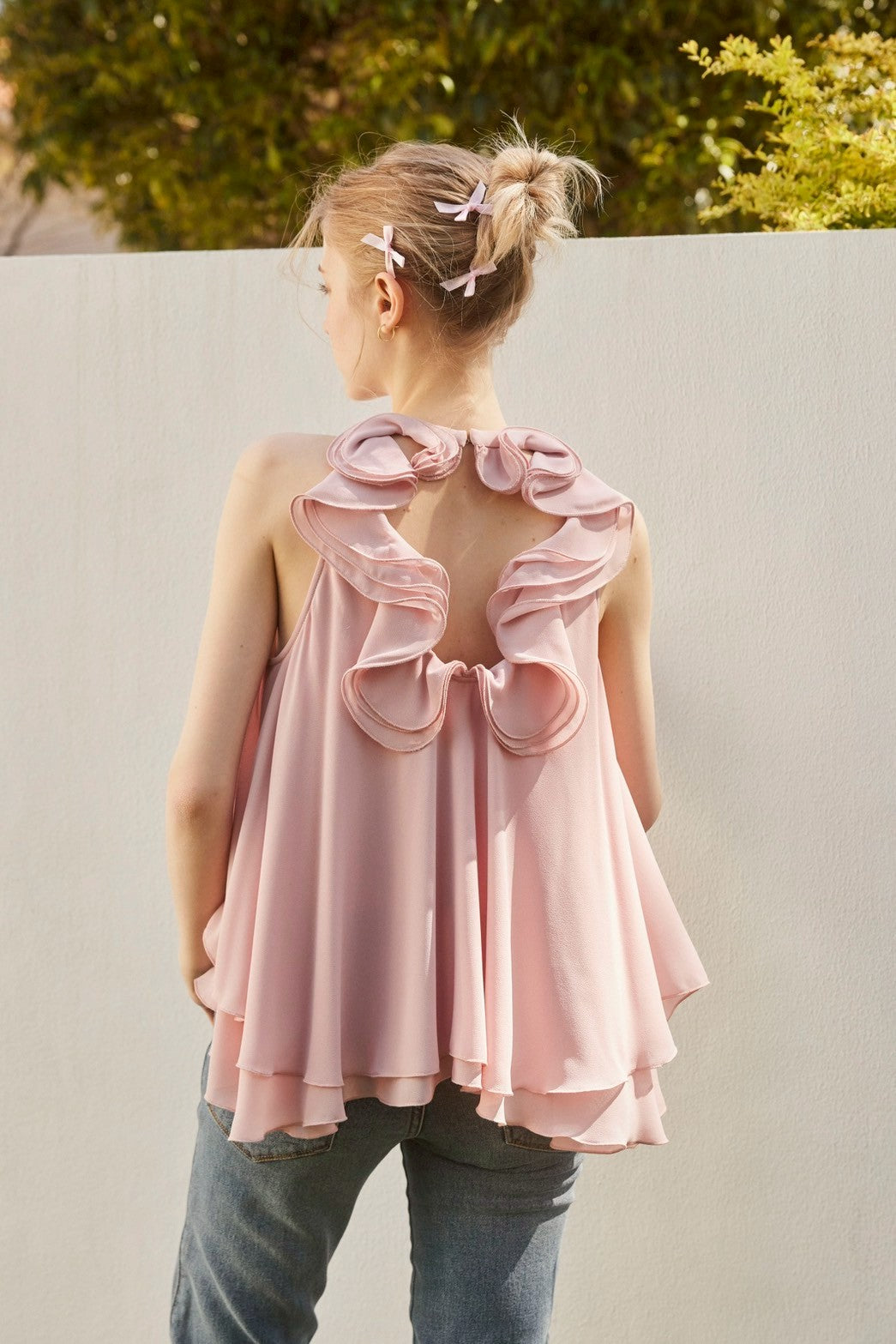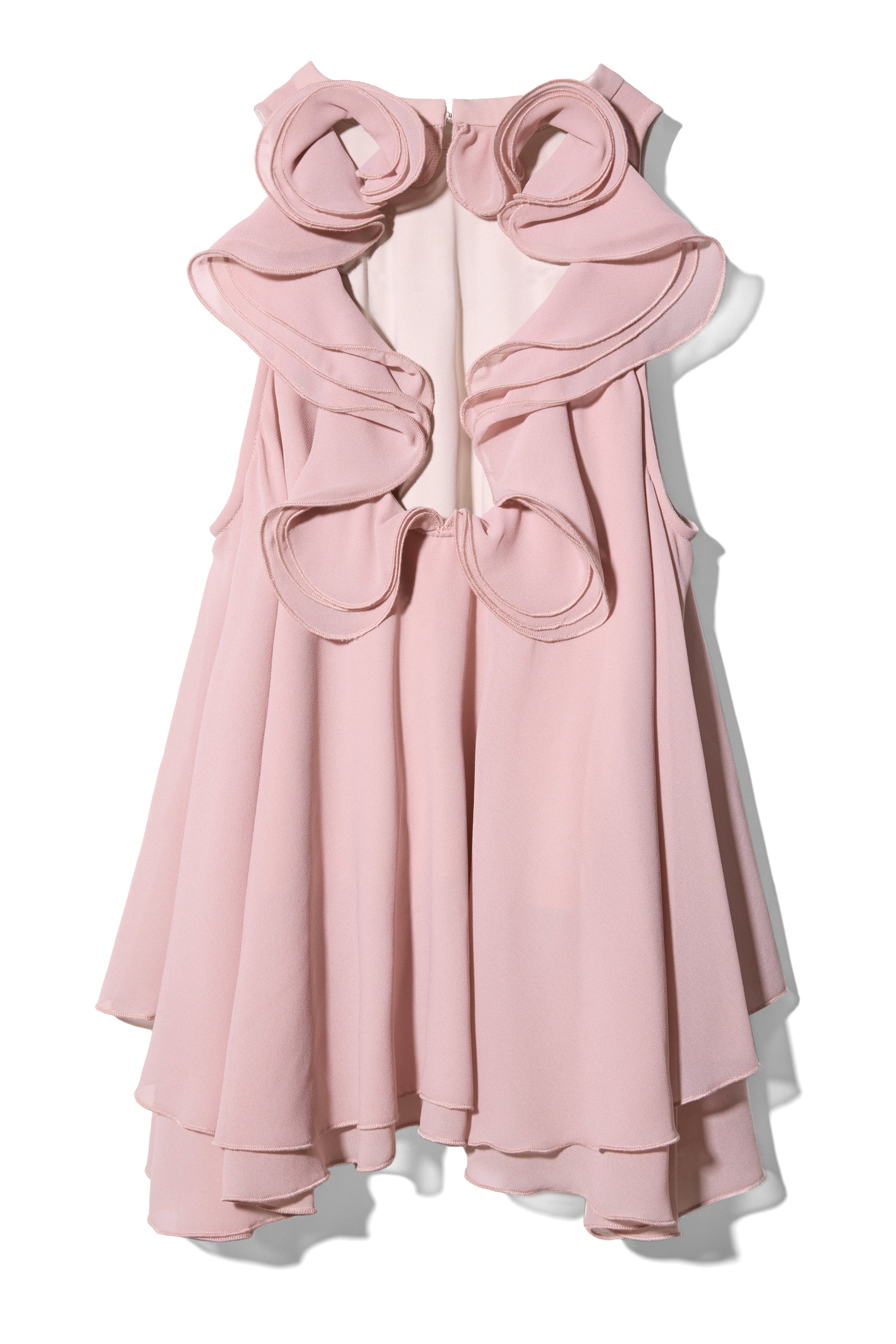 バックスタイルに大胆なスカラップ風ラッフルと肌見せデザインで後ろ姿にインパクトを。