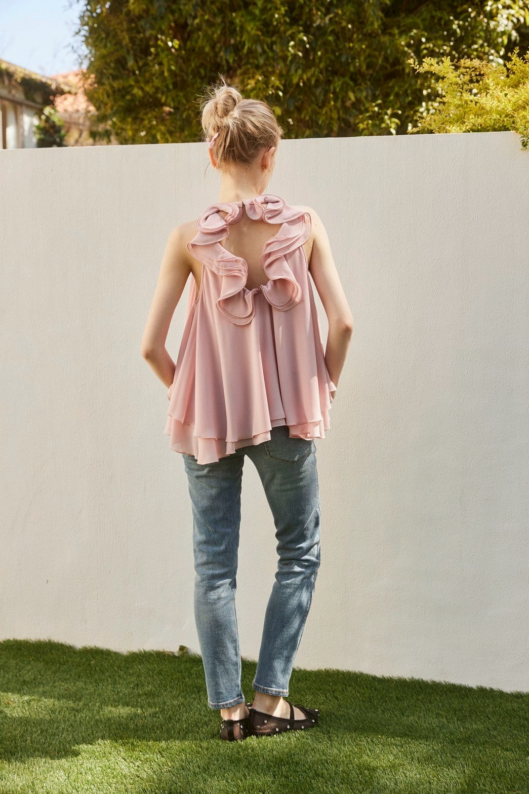 フロントはシンプルながらも、背面に華やかなラッフルデザインが施され、