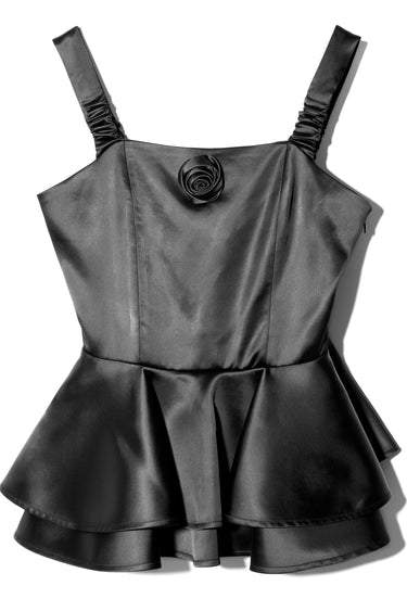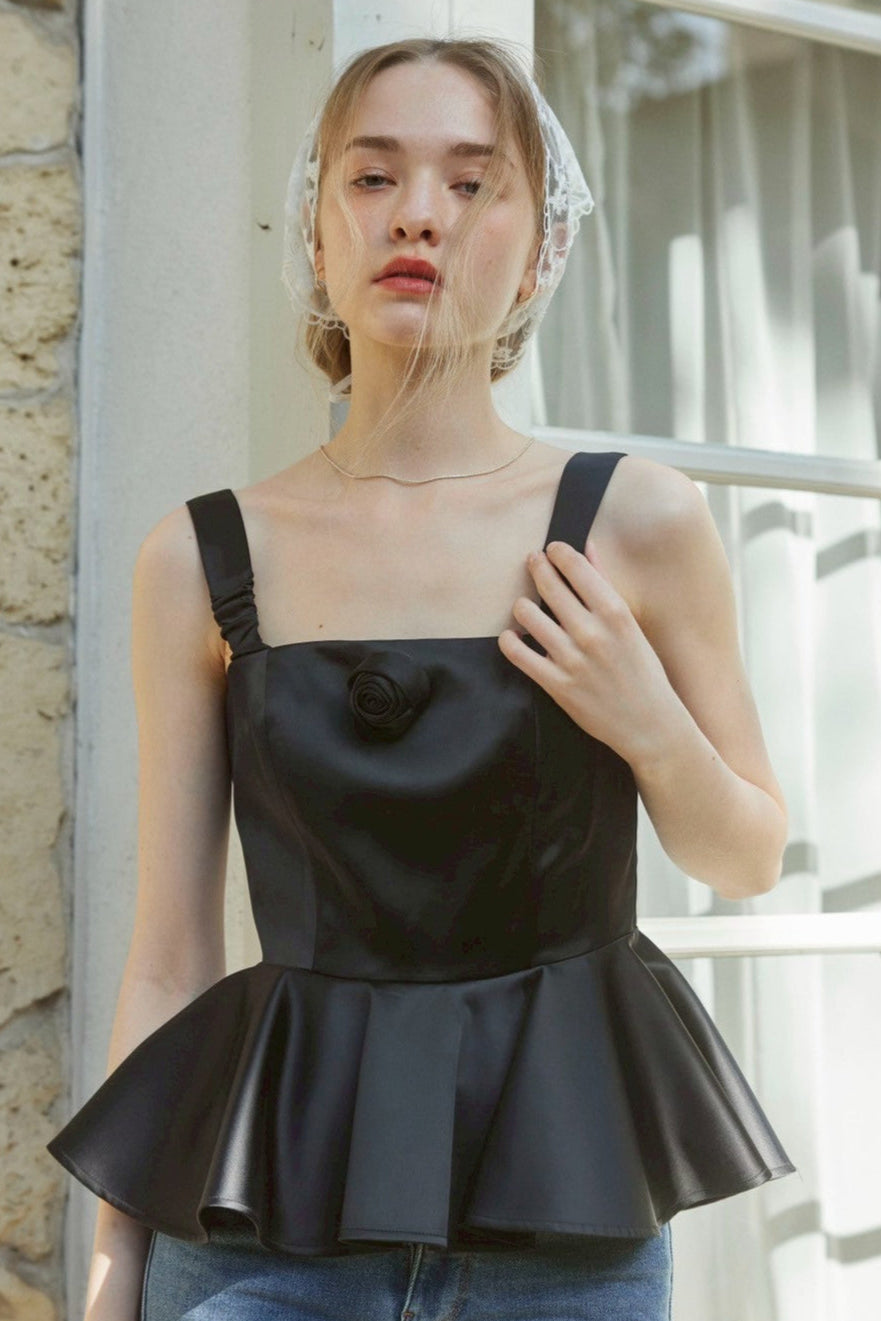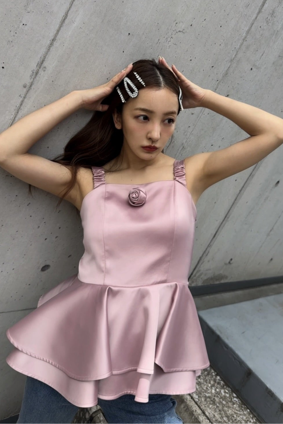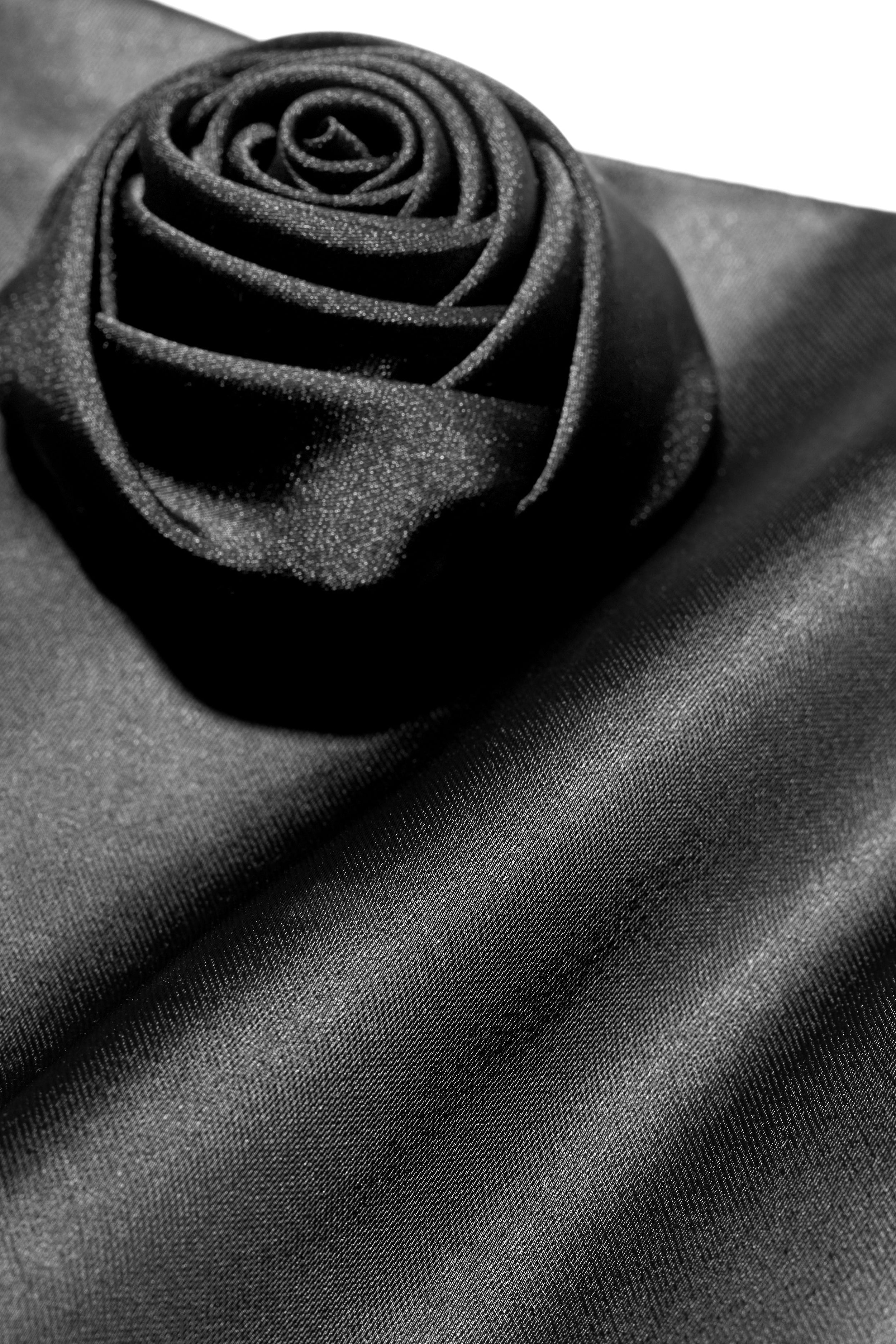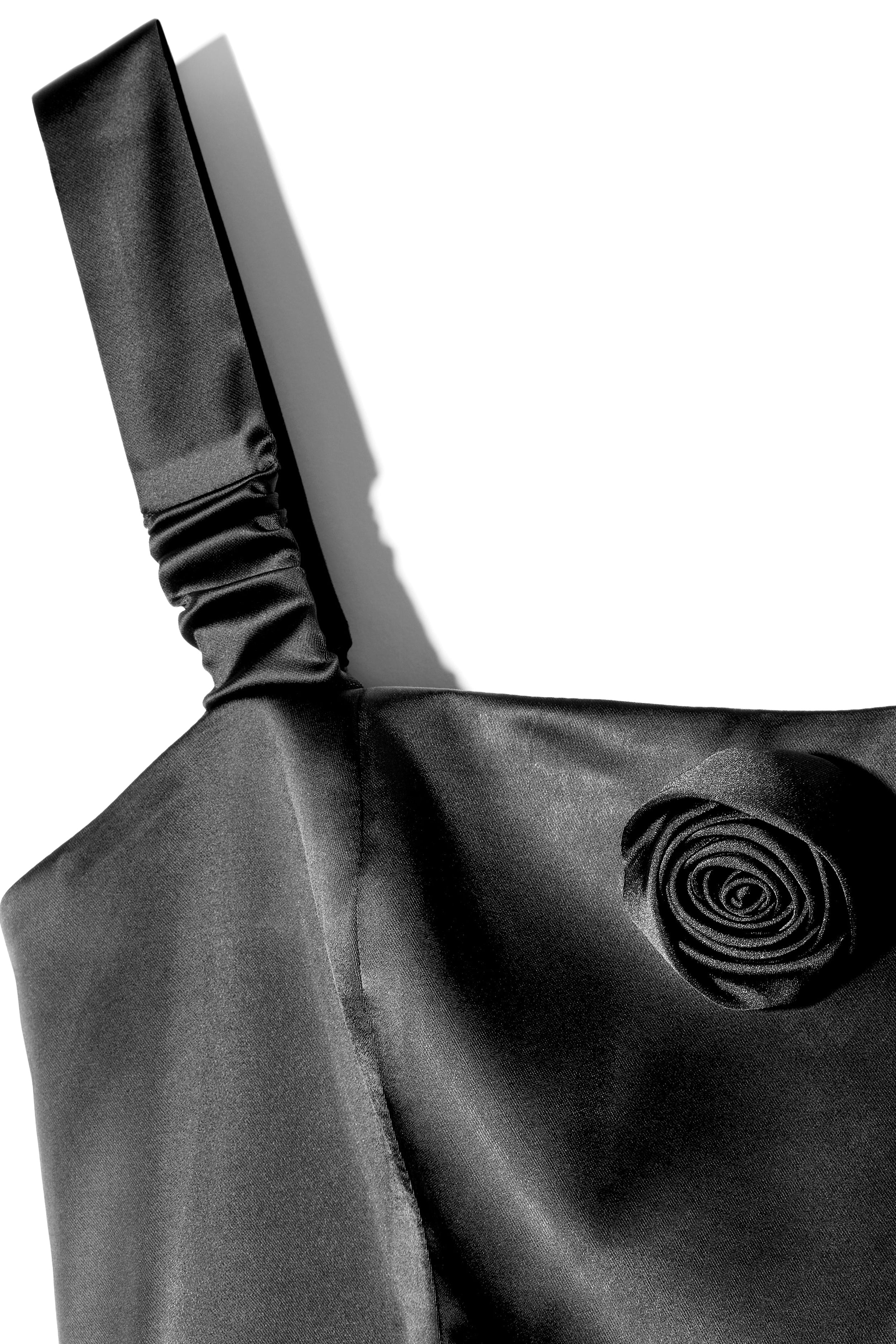 スクエアネックと幅広のショルダーストラップがクラシカルな印象を与えつつ、胸元のローズモチーフが華やかさをプラス。