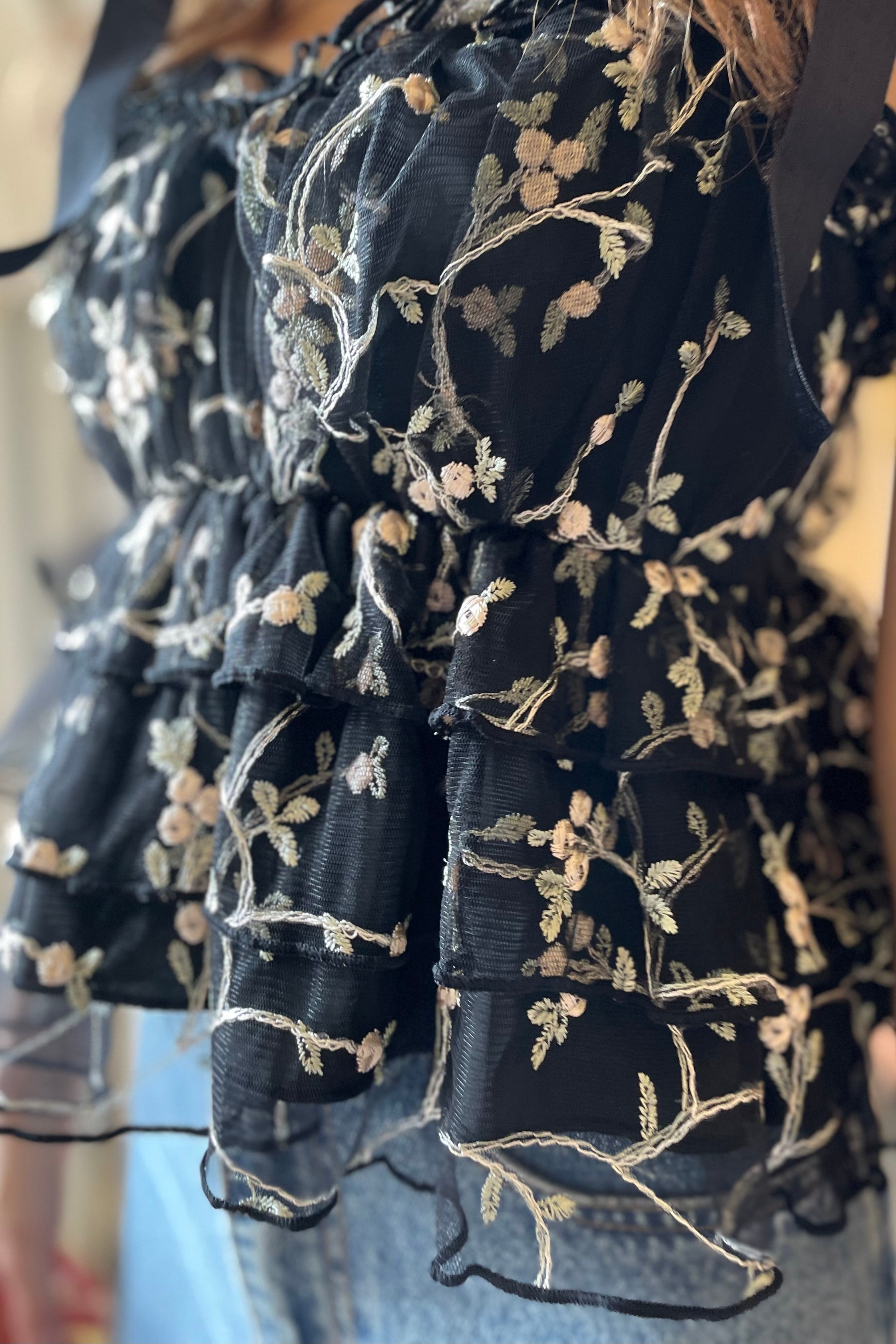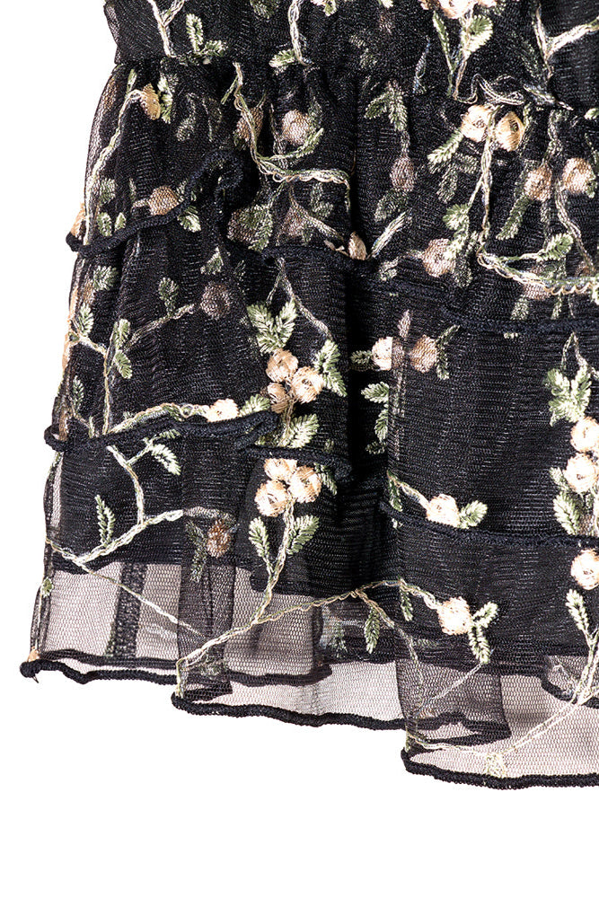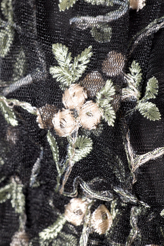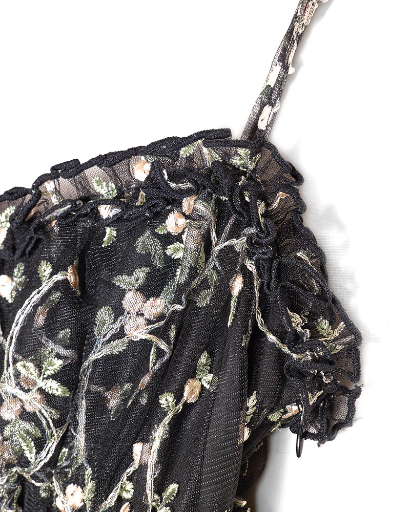 贅沢に使ったチュール素材に繊細なフラワーの刺繍を施したフェミニンに。