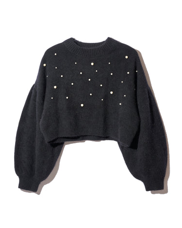 さまざまなサイズ感のパールを散りばめたたニットトップス。