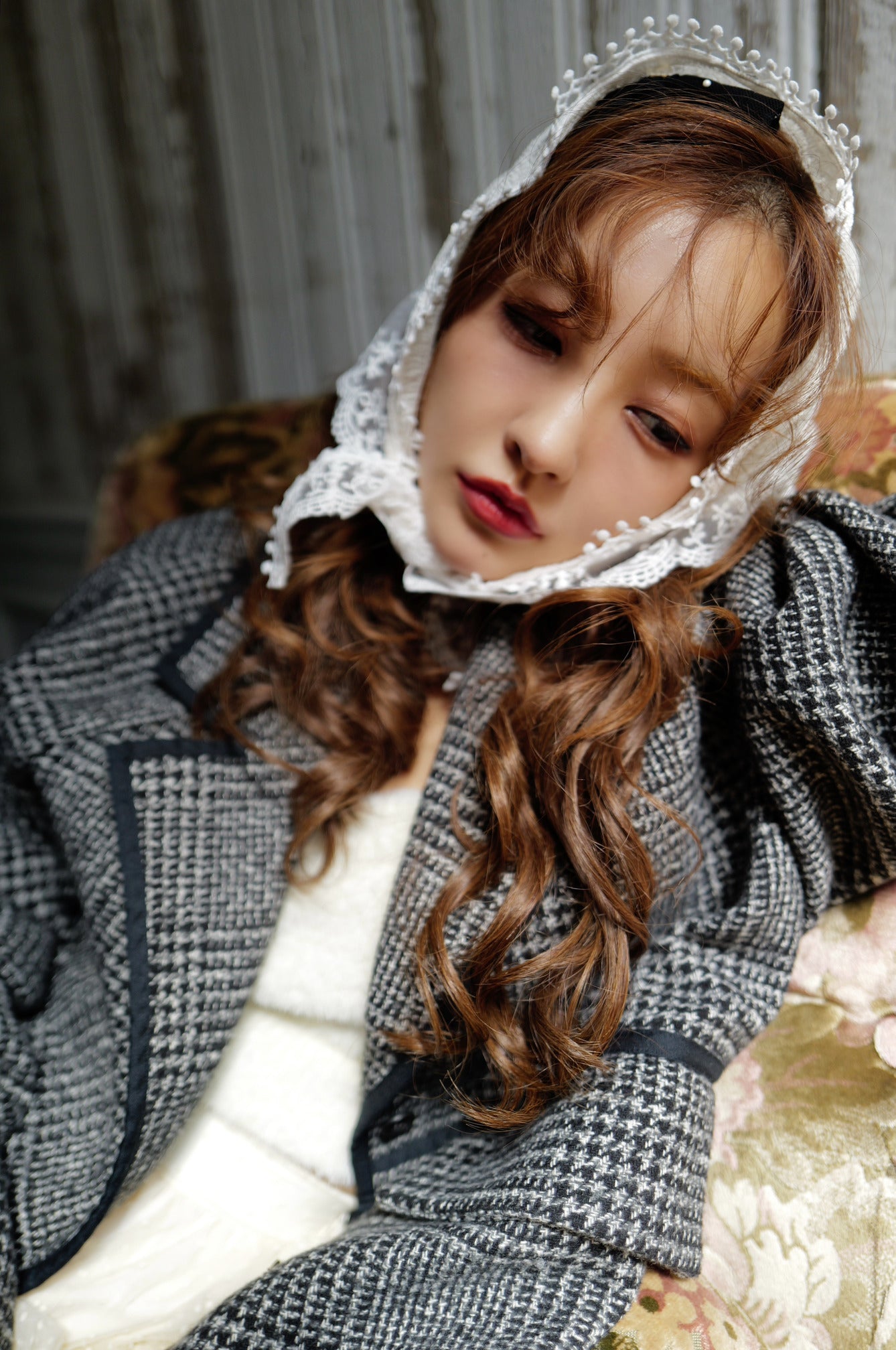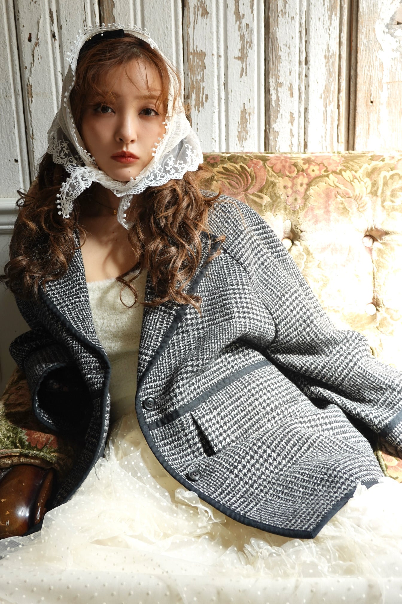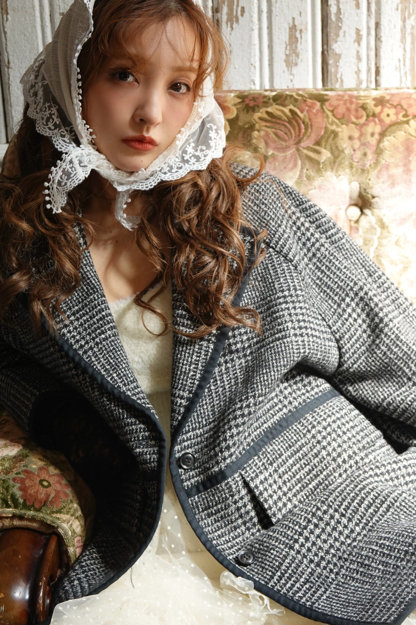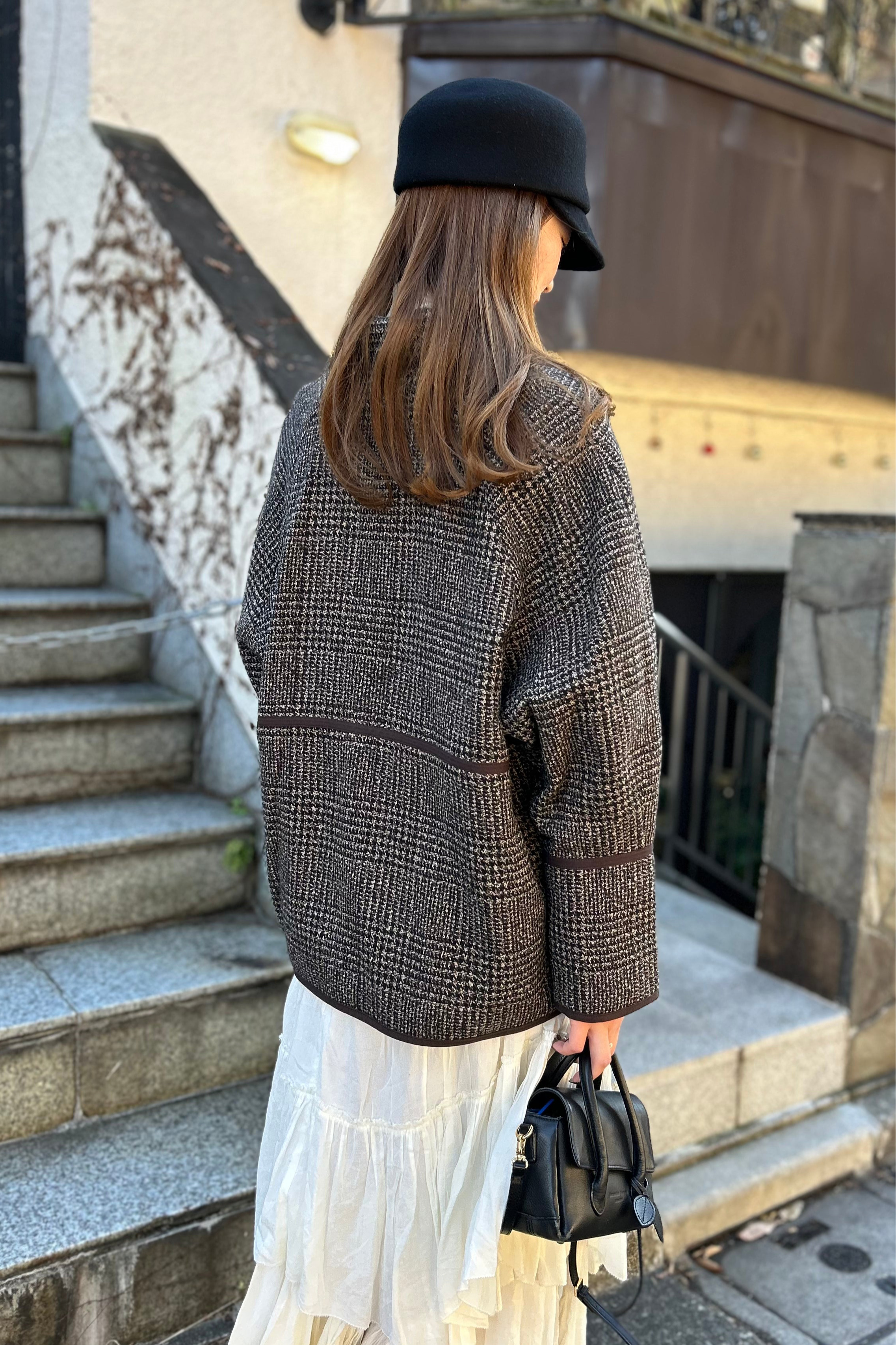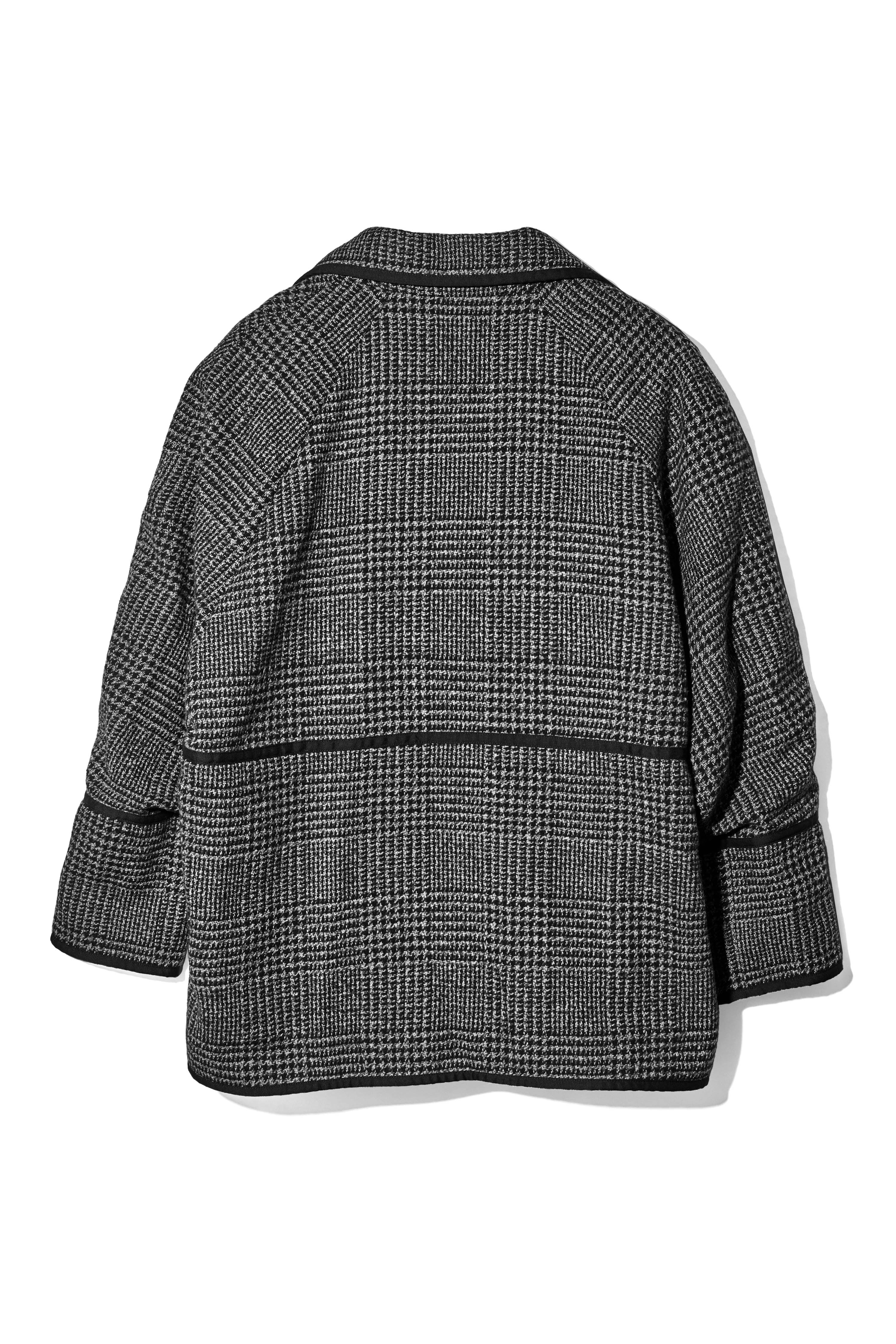 クラス感のあるツイード素材を使用し顔まわりをすっきりと見せる大きめ襟のデザイン。