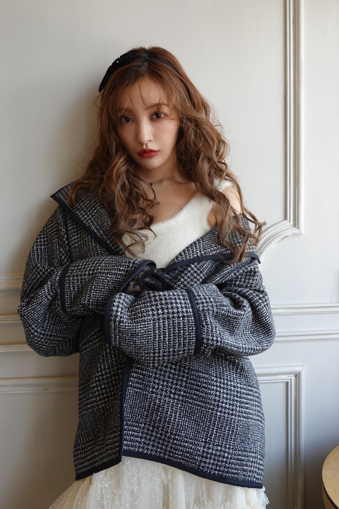 さりげない千鳥柄がラグジュアリーな印象にも導くコート。