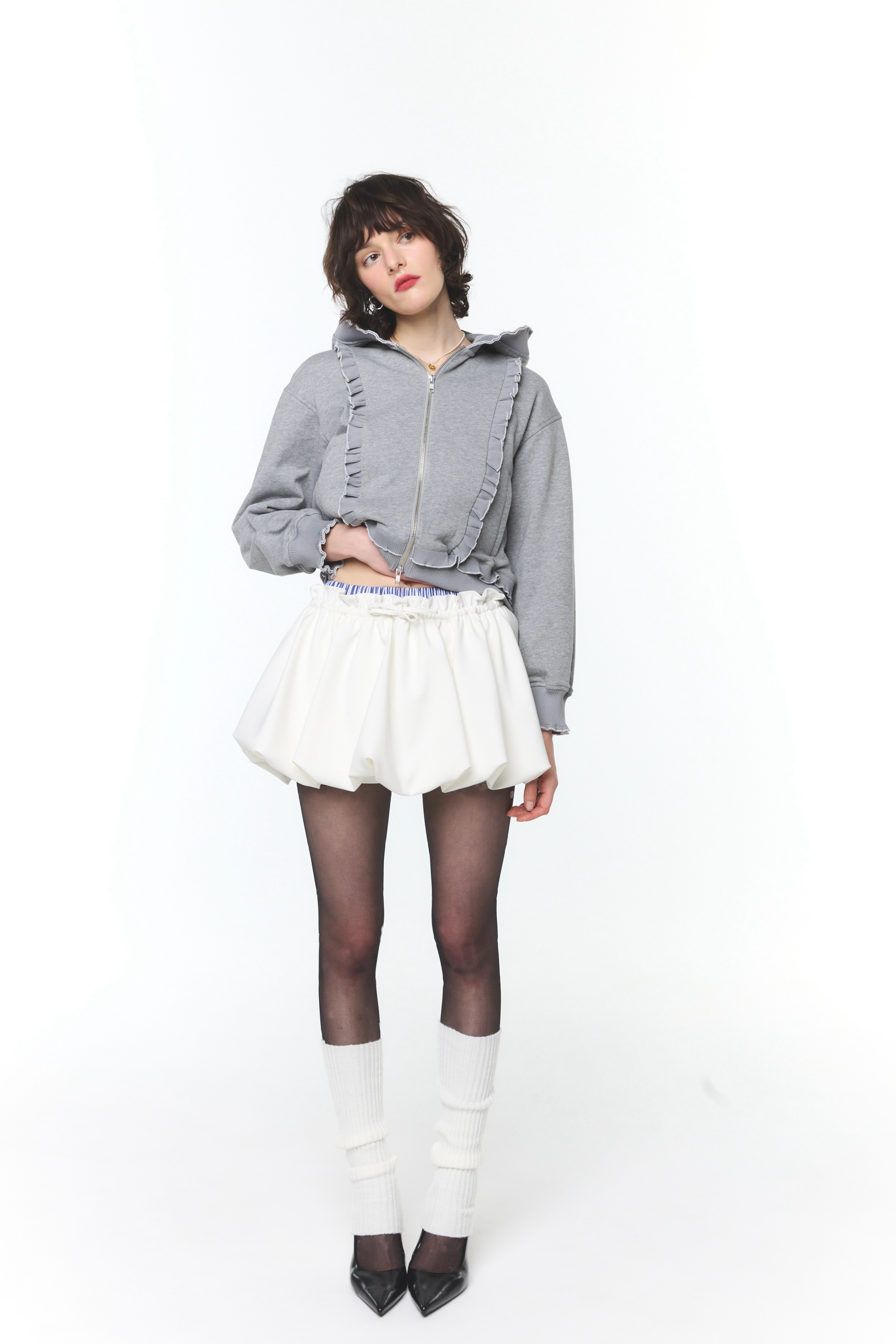 尖头翻领设计和垫肩设计,打造出一种男性化的廓形,凸显肩宽。袖口可卷起,穿着时可露出衬里。领口有纽扣,因此也可以竖起领口穿着。